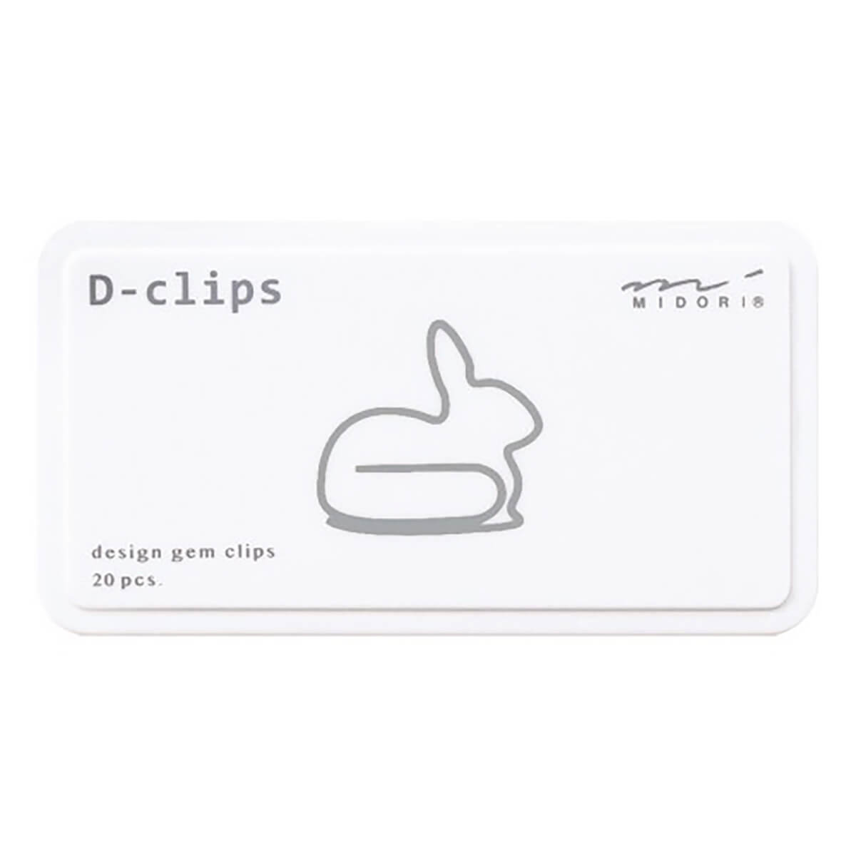 Rabbit D-Clip paterclips by Midori. Shaped metal paper clips from Midori presented in a matchbox style handy solid storage box with a sliding lid. A Japanese stationery classic.
