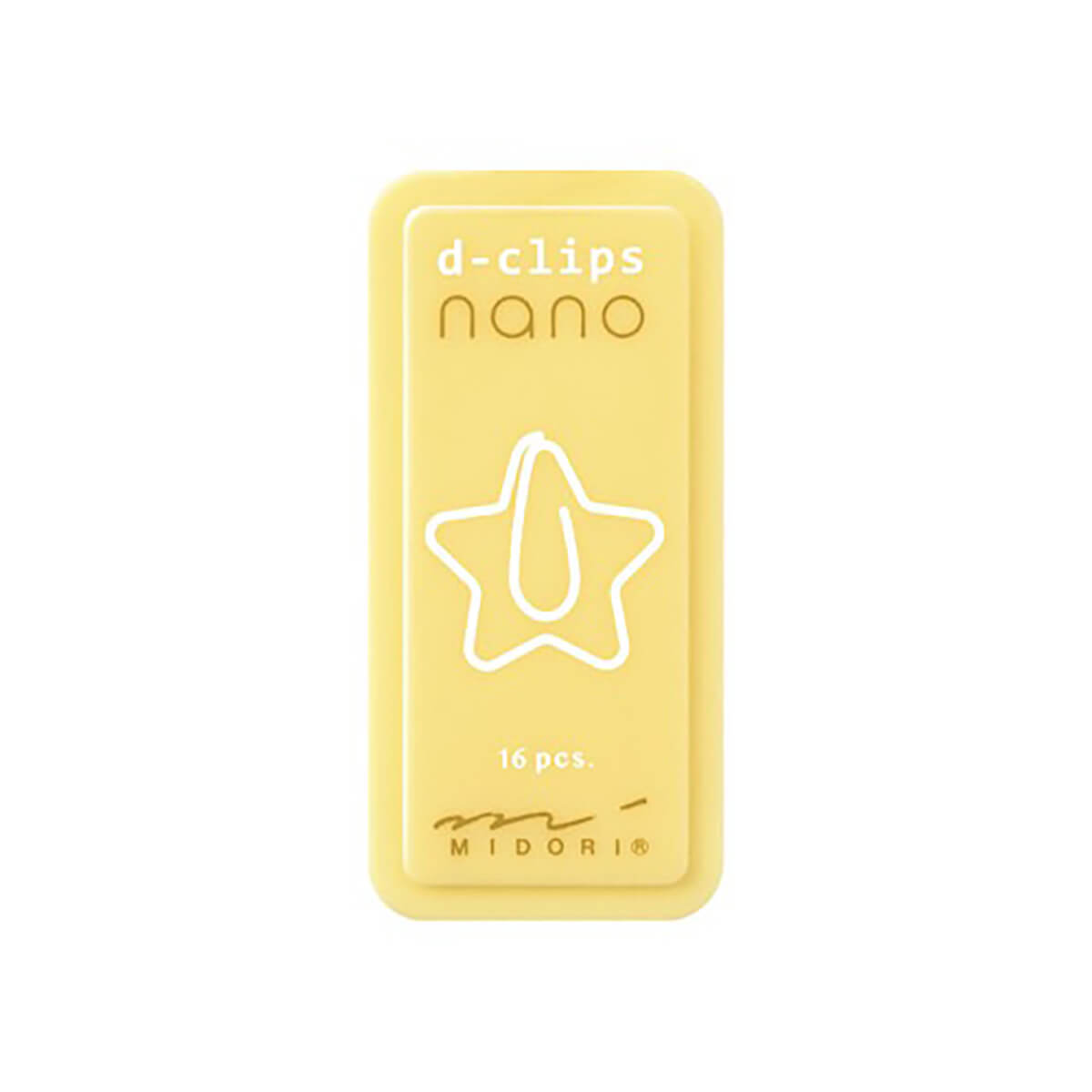 Star D-clip Nano paperclips by Midori. Tiny shaped metal paper clips in a matchbox sized handy solid storage box with sliding lid. The Nano paperclips are a new designed tiny clip that combines design and functionality. A Japanese stationery classic.