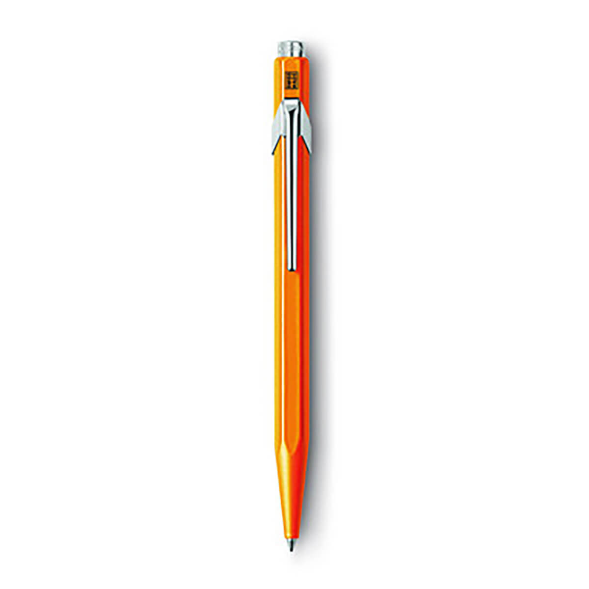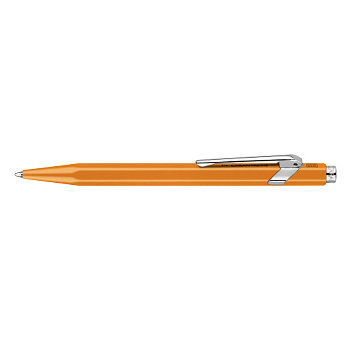 849 Ballpoint Pen in Orange Fluo by Caran d'Ache. Classic but stylish ballpoint pen with powder-coated aluminium body and Caran d'Ache's signature hexagonal shape. Push button and handy steel pocket clip.