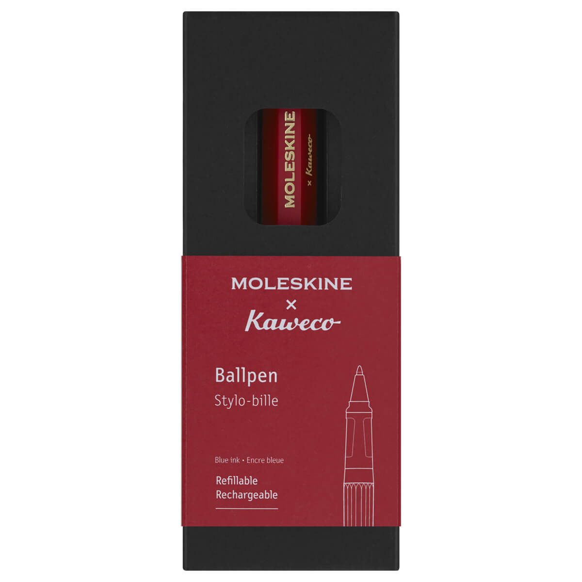 Ballpen in Red by Moleskine X Kaweco. The classic chunky ballpoint pen by Kaweco for Moleskine, with blue ink and a one millimetre tip. Refillable - takes a G2 type refill. Comes packaged in a reusable cardboard box with an 'in case of loss' notice printed inside.