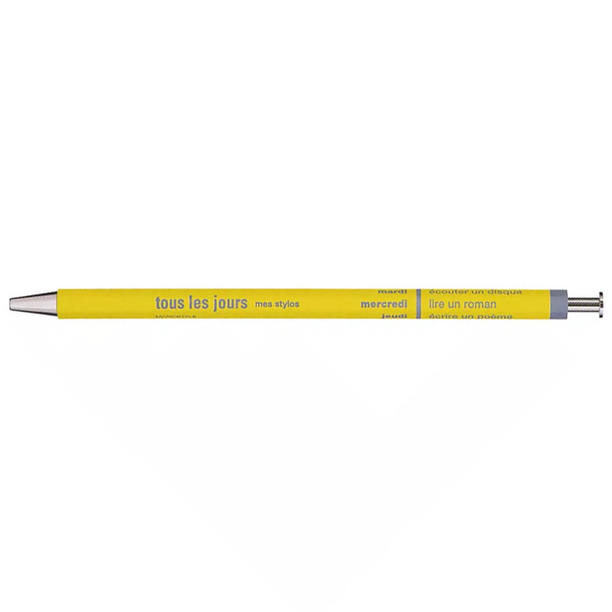 Days ballpoint pen by Marks Inc. These fun and delicate Japanese ballpoint pens are a dream to write with. With their hexagonal wooden body and ultra fine nib with black ink, the Days pens are perfect for drawing, sketching and calligraphy. Ballpoint pen with a hexagonal wooden body featuring French phrases with ideas on how to spend every day of the week.