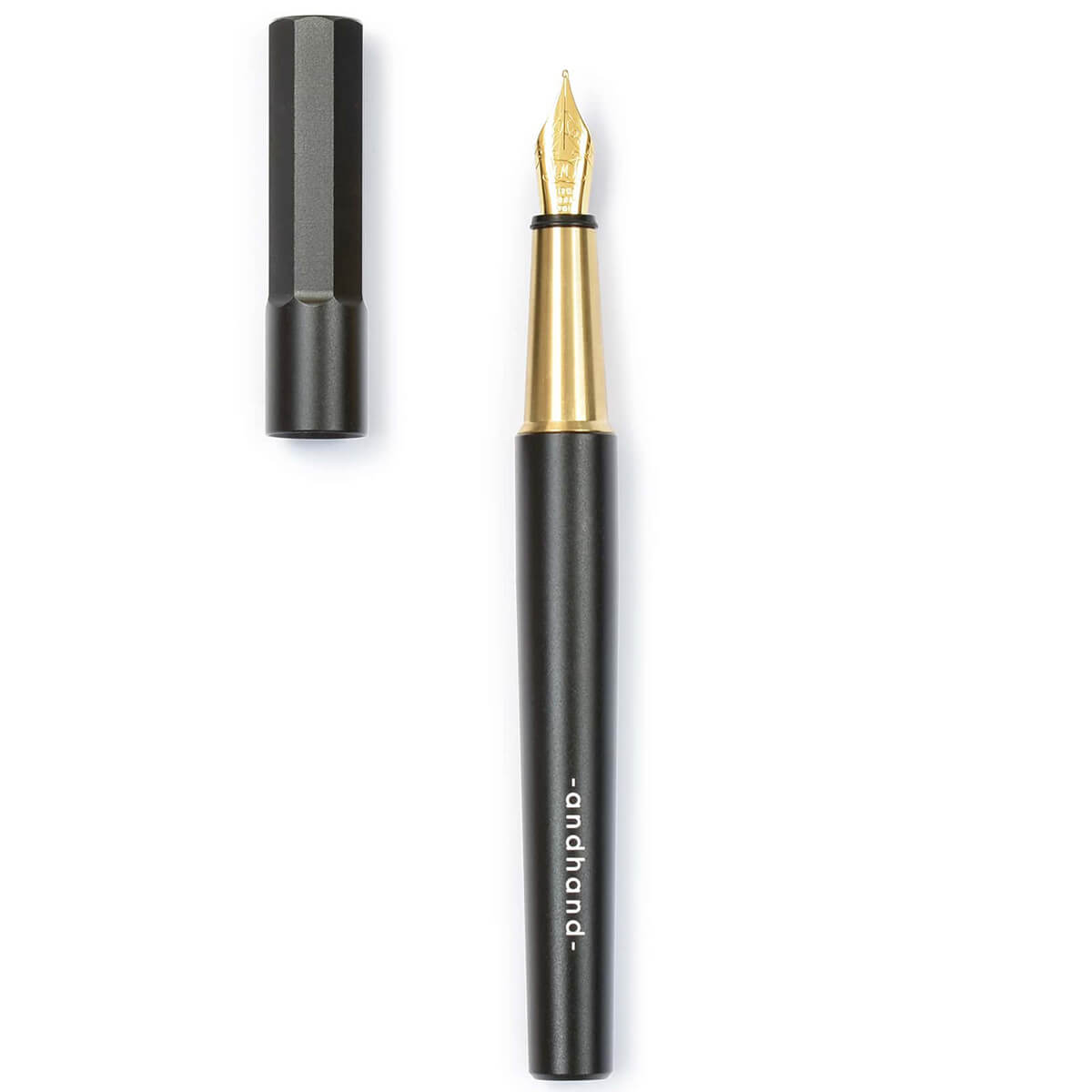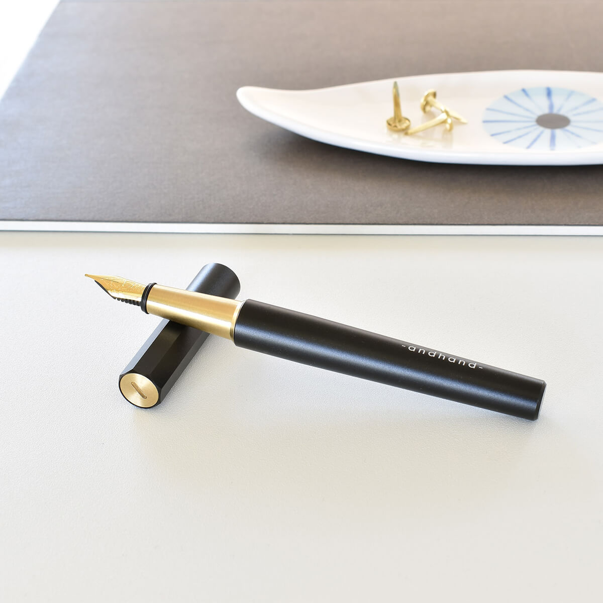 Method Fountain Pen in Black & Brass by Andhand. The minimally elegant method fountain pen from Andhand is carefully machined from solid brass and comes fitted with a high quality Gold plated Schmidt nib and ink converter allowing an infinite choice when it comes to ink preference. The solid brass used for the fountain pen gives it an excellent writing weight and balance in the hand making it an absolute pleasure to use and something to treasure for a lifetime.