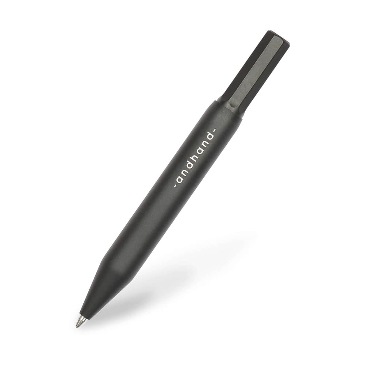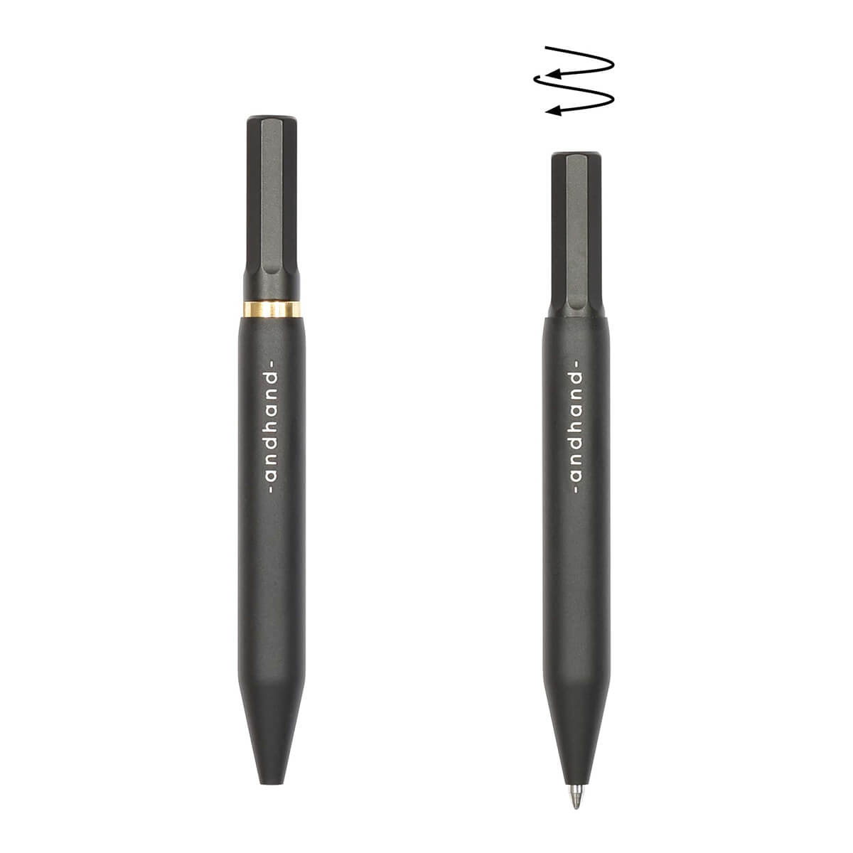Method Mini Pen in Black by Andhand. The method pen is a timeless piece with modern appeal. The all metal construction of this retractable pen has been crafted with precision and features an elegant twist and retract movement revealing a contrast of brass in its retracted position. The mini 4 inch pen version offers all the same qualities as its larger counterpart but in a convenient everyday carry size.