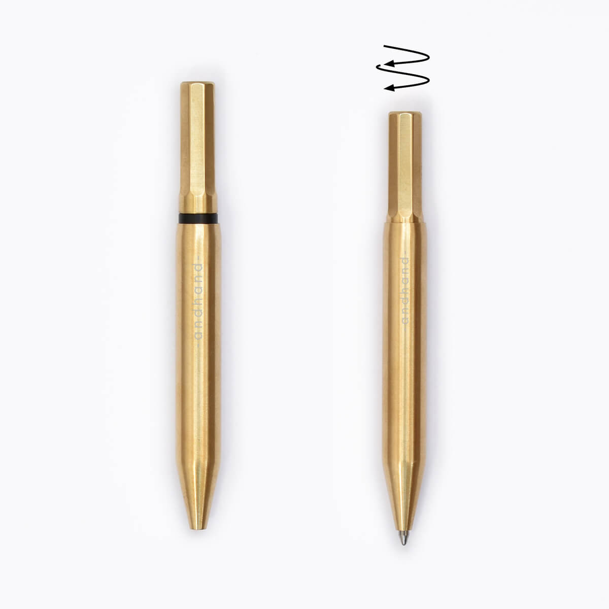 Method Mini Pen in Brass by Andhand. The method pen is a timeless piece with modern appeal. The all metal construction of this retractable pen has been crafted with precision and features an elegant twist and retract movement revealing a contrast of brass in its retracted position. The mini 4 inch pen version offers all the same qualities as its larger counterpart but in a convenient everyday carry size.