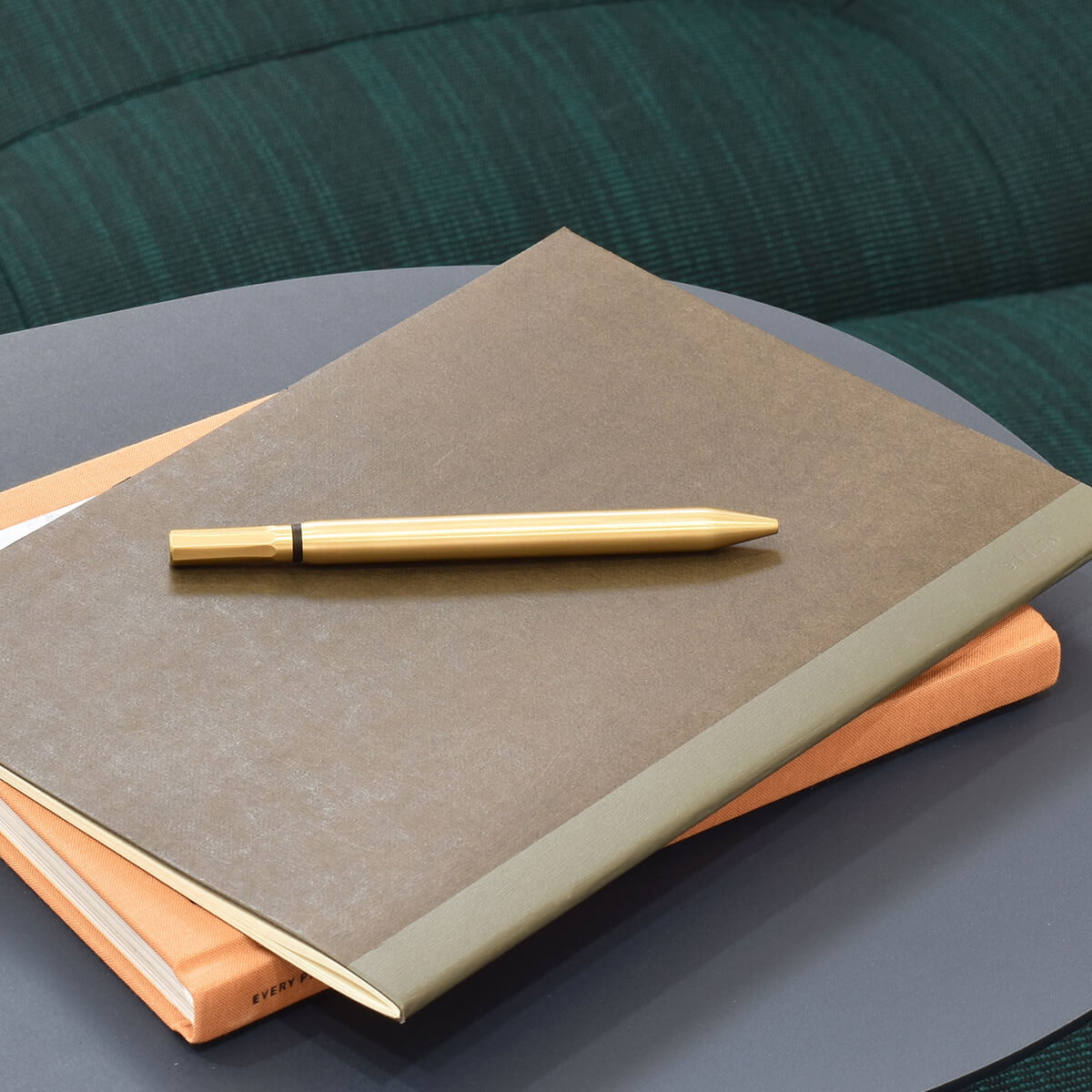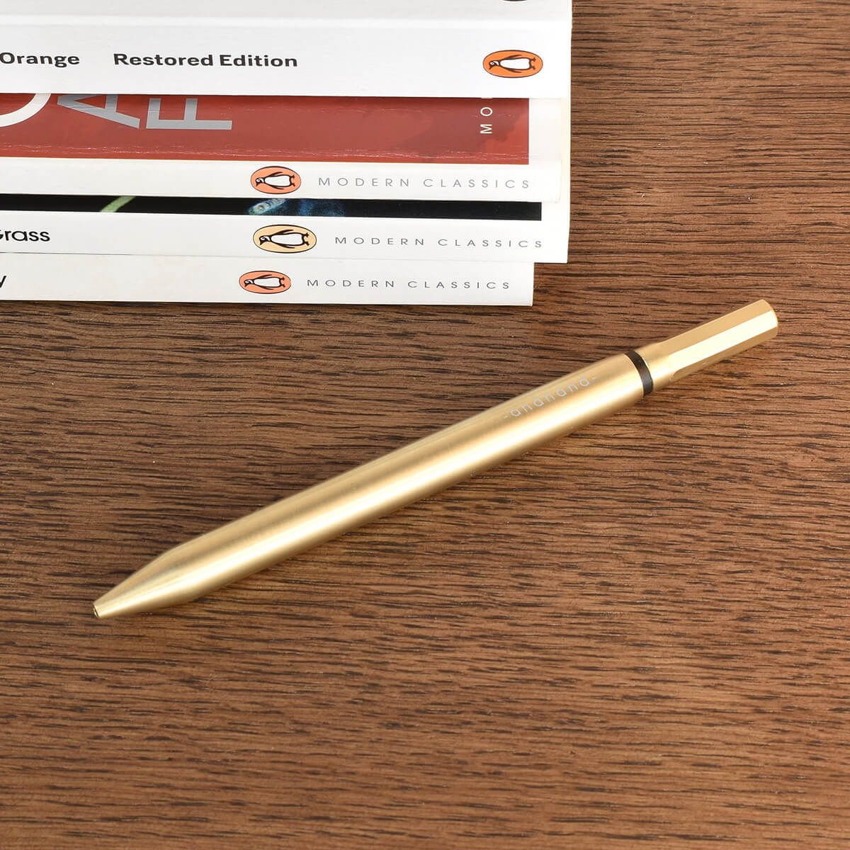 Method Pen in Brass by Andhand. The brass series method pen is a timeless piece with modern appeal. The all metal construction of this retractable pen has been crafted with precision and features an elegant twist movement revealing a contrast of black in its retracted position.