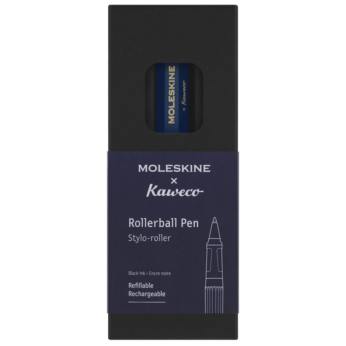Rollerball pen in sapphire blue by Moleskine X Kaweco. The classic chunky pen by Kaweco for Moleskine, with black ink and a 0.7 millimetre tip. Refillable - takes a euro type refill. Comes packaged in a reusable cardboard box with an 'in case of loss' notice printed inside.