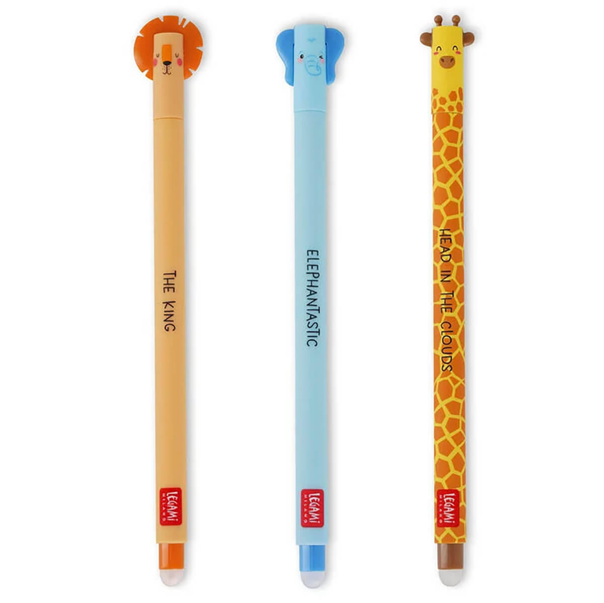 Safari set of 3 erasable pensby Legami. We all make mistakes now and then. But we don't all have an entire team of friends ready and waiting to correct our errors! Be prepared for any mistake with a Set of 3 Wild Savannah Lion, Elephant and Giraffe Erasable Gel Pens from Legami , with orange, blue and black ink. Write and doodle to your heart's content, erasing when needed, because with thermo-sensitive ink, you won't need to throw the whole page away. The trees will thank you!