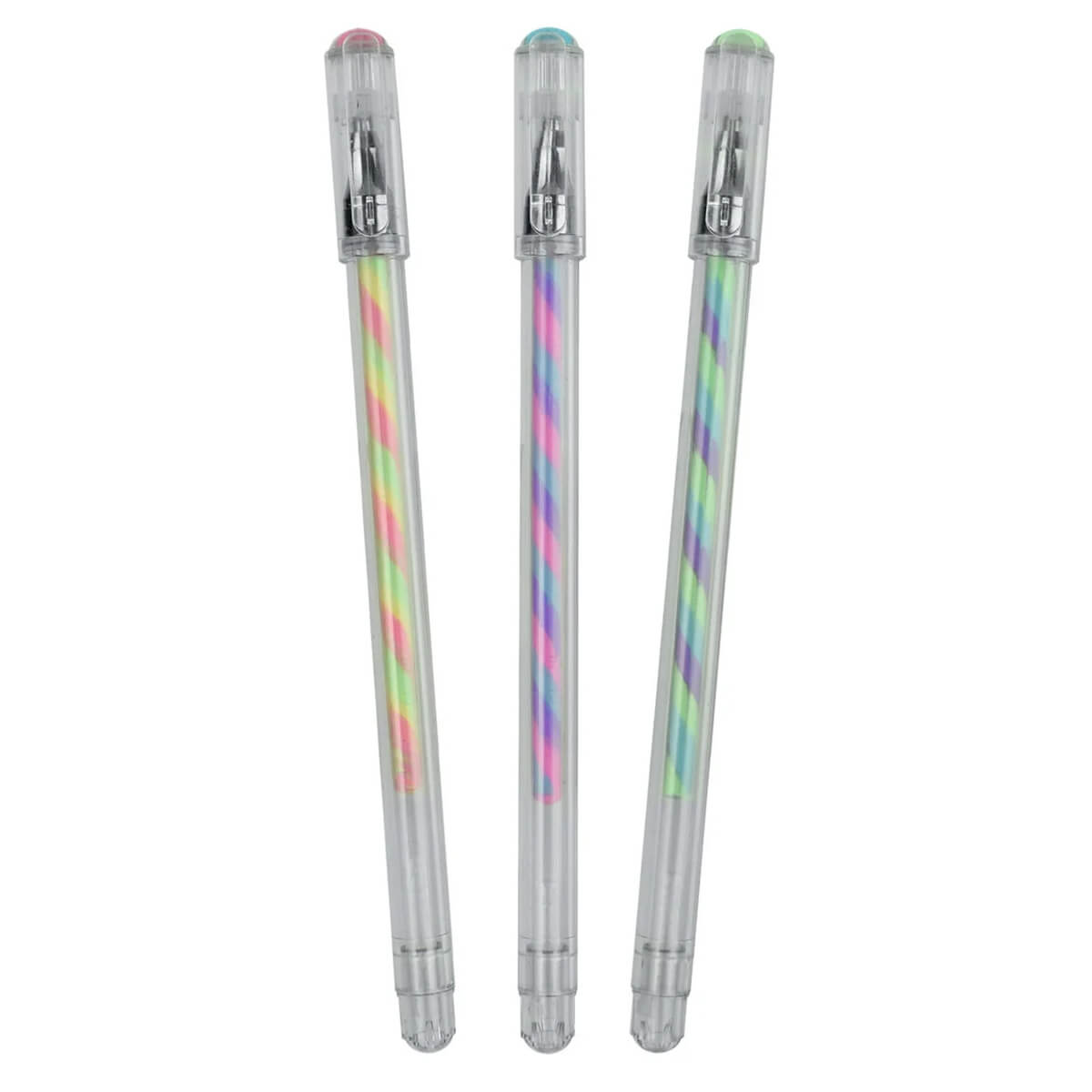 Twist set of three multicolour gel pens by Legami. Multicolour gel pens with a 1.0mm tip. There are three different coloured inks that intertwine inside the pen case, so that your writing and drawing comes out in rainbow colours. The set includes three different rainbow colours; purple, turquoise and pink, yellow, pink and green, and green, turquoise and purple.