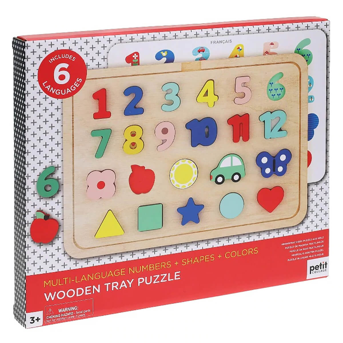 Little ones can learn numbers, shapes, and colours in 6 different languages with this multi-language Numbers, Shapes & Colours Wooden Sorting Tray Puzzle from Petit Collage!