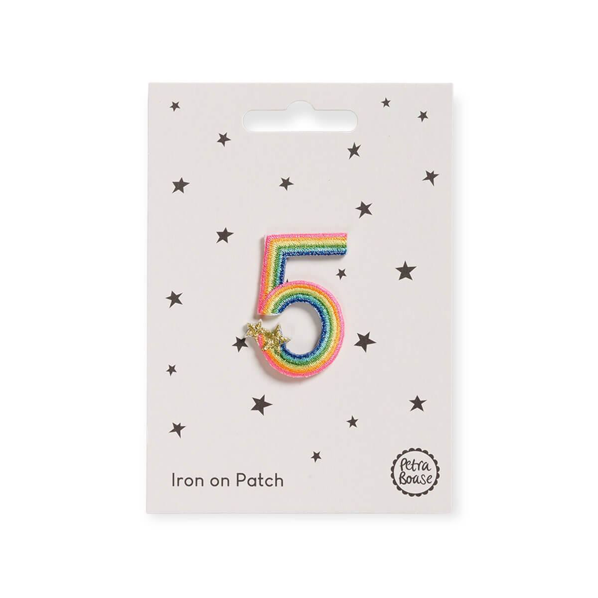 Rainbow Number 5 iron on patch by Petra Boase. Richly embroidered colourful rainbow number patch, with an iron-on backing so can be removed from the card and ironed on to a favourite t-shirt, rucksack or whatever you like!