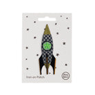 Rocket iron on patch by Petra Boase. Richly embroidered colourful patch, with an iron-on backing so can be removed from the card and ironed on to a favourite t-shirt, rucksack or whatever you like! The patch is grey, with multi coloured embroidered detailing.