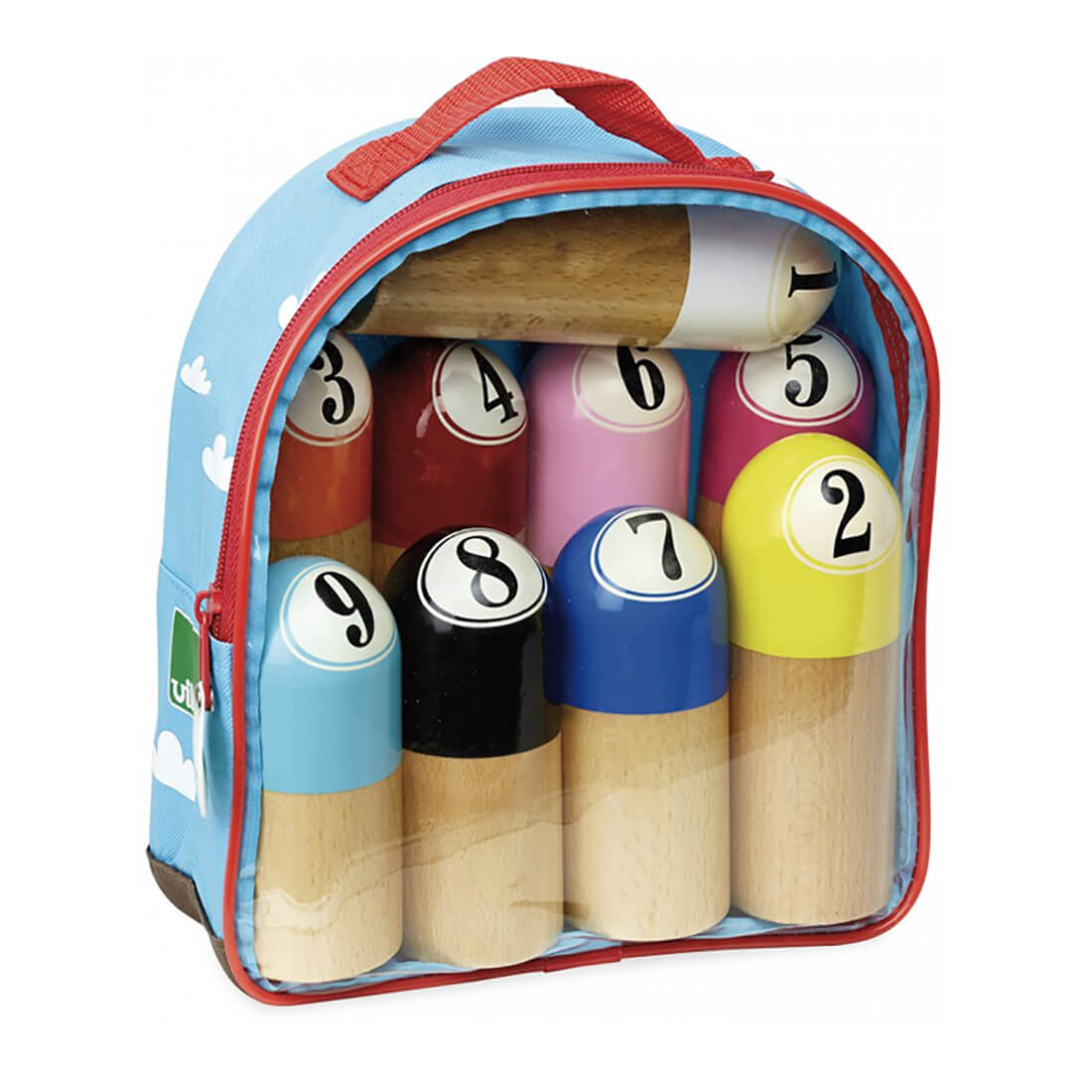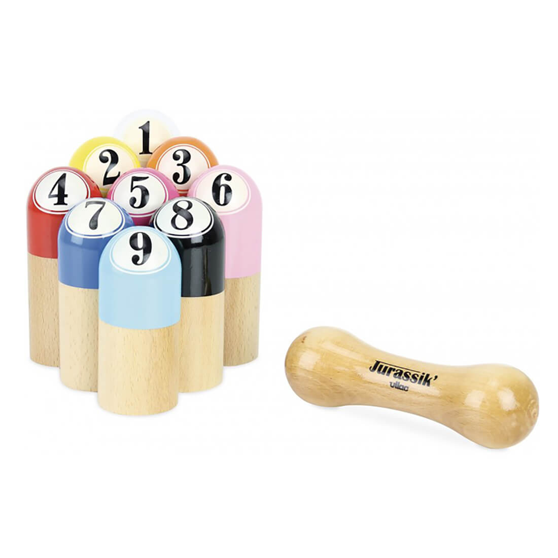 Jurassik 9 skittles game by Vilac. Wooden skittles, beautifully designed by specialist French toymakers Vilac, who have been producing timeless heirloom toys since 1911.