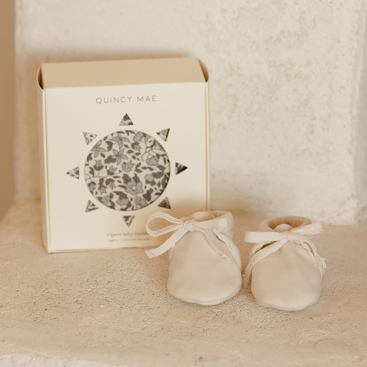 Baby booties by Quincy Mae. The softest baby pram shoes to complete any outfit. With ties for a secure fit.