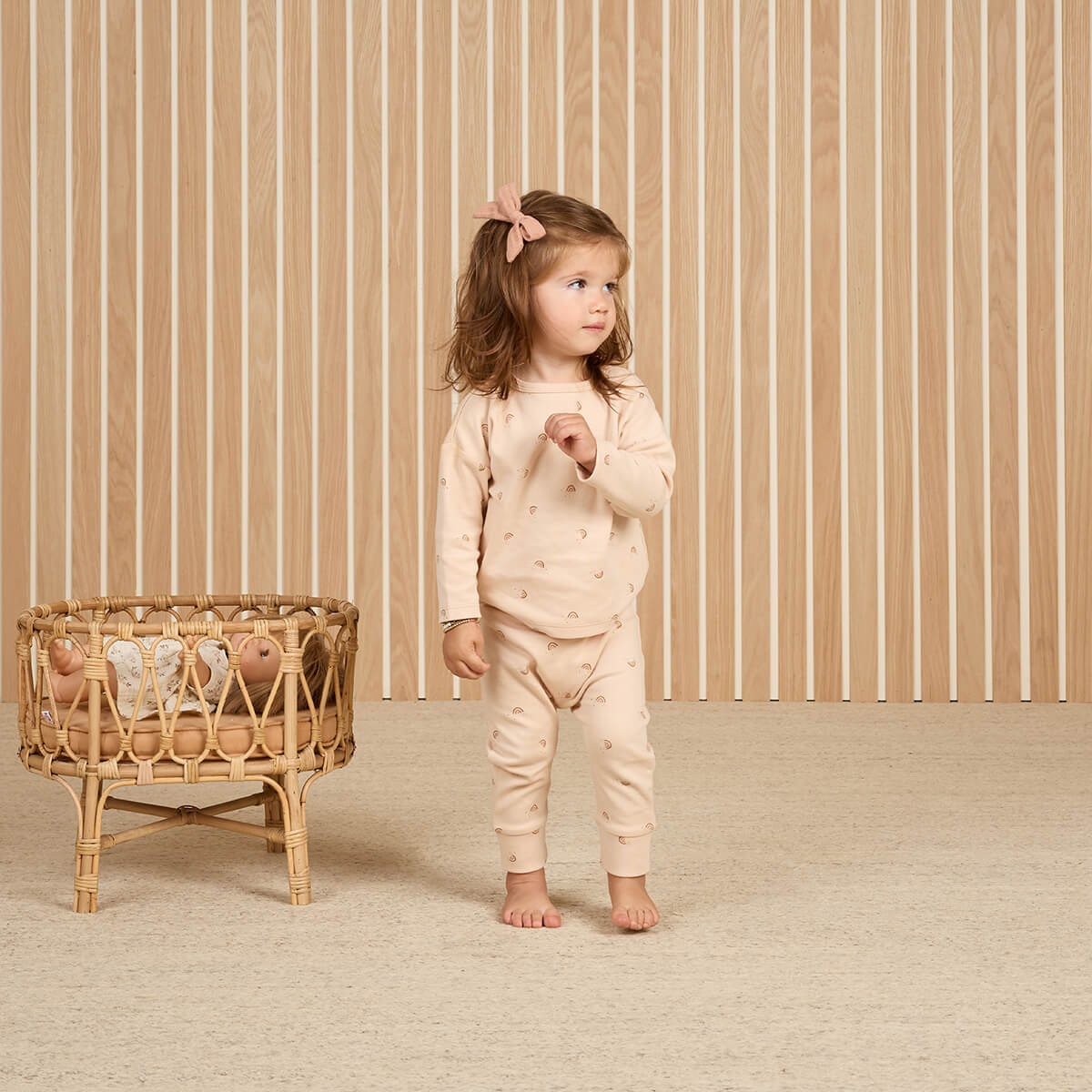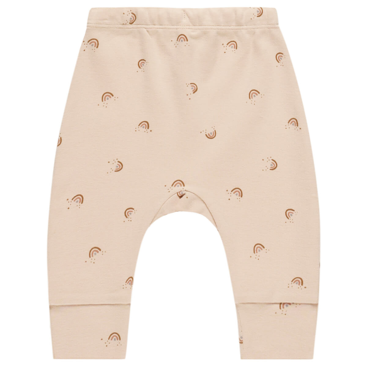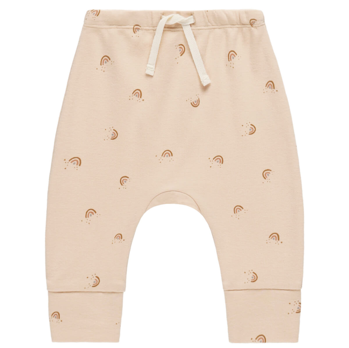 Drawstring Pants by Quincy Mae. Drawstring pants with an elastic waistband made out of velvety soft organic brushed fabric. In all over rainbows print on soft pink fabric.