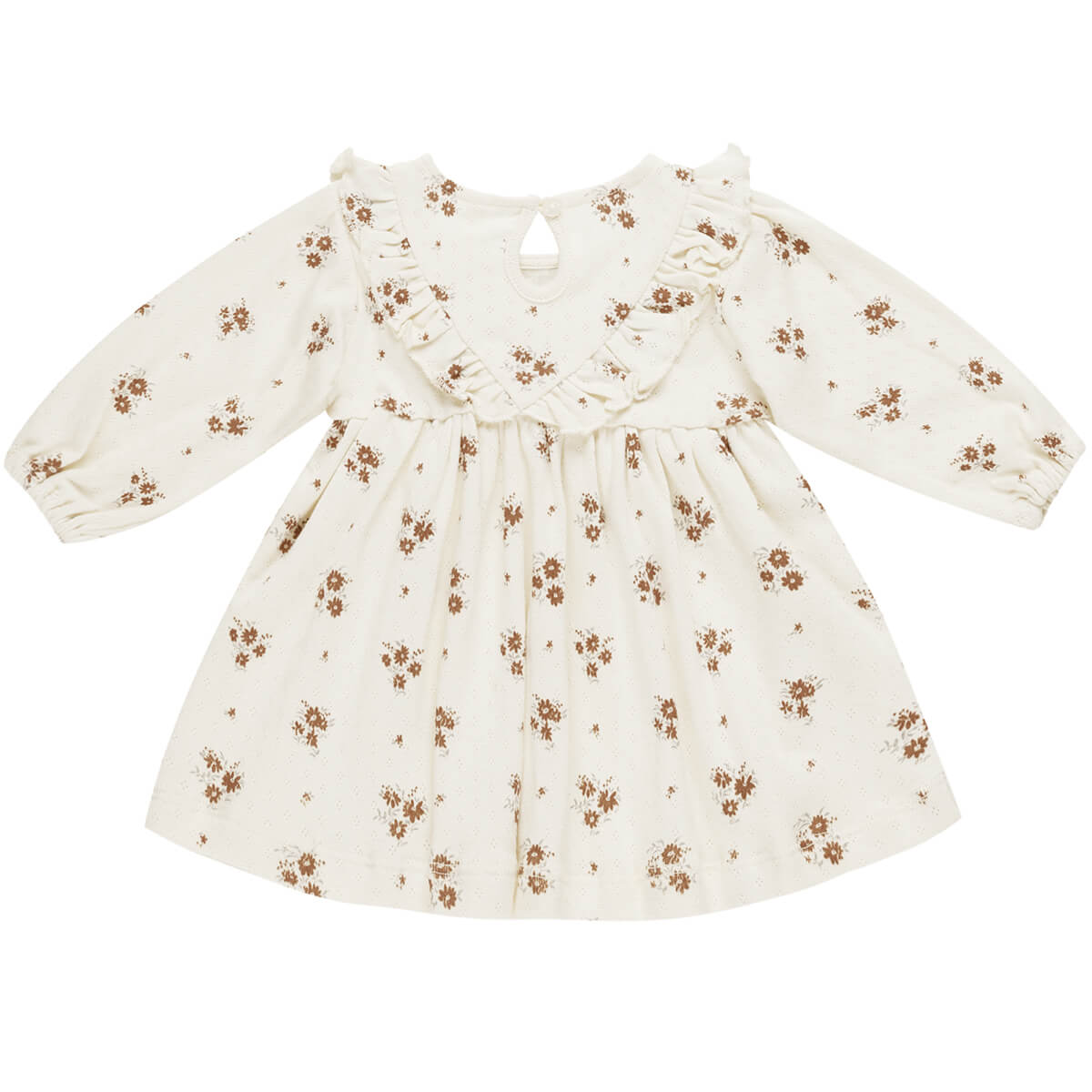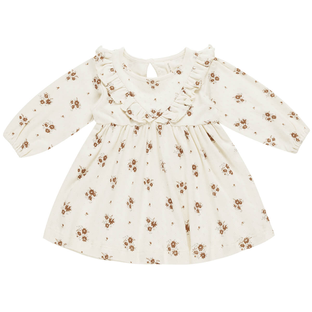 Long Sleeve Ruffle V Dress by Quincy Mae. Long sleeve dress with sweet ruffle detail in our classic pointelle fabric. Button back closure for easy changing and includes cute baby bloomers.