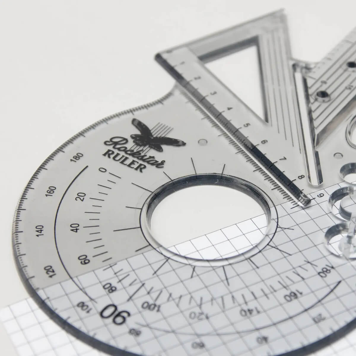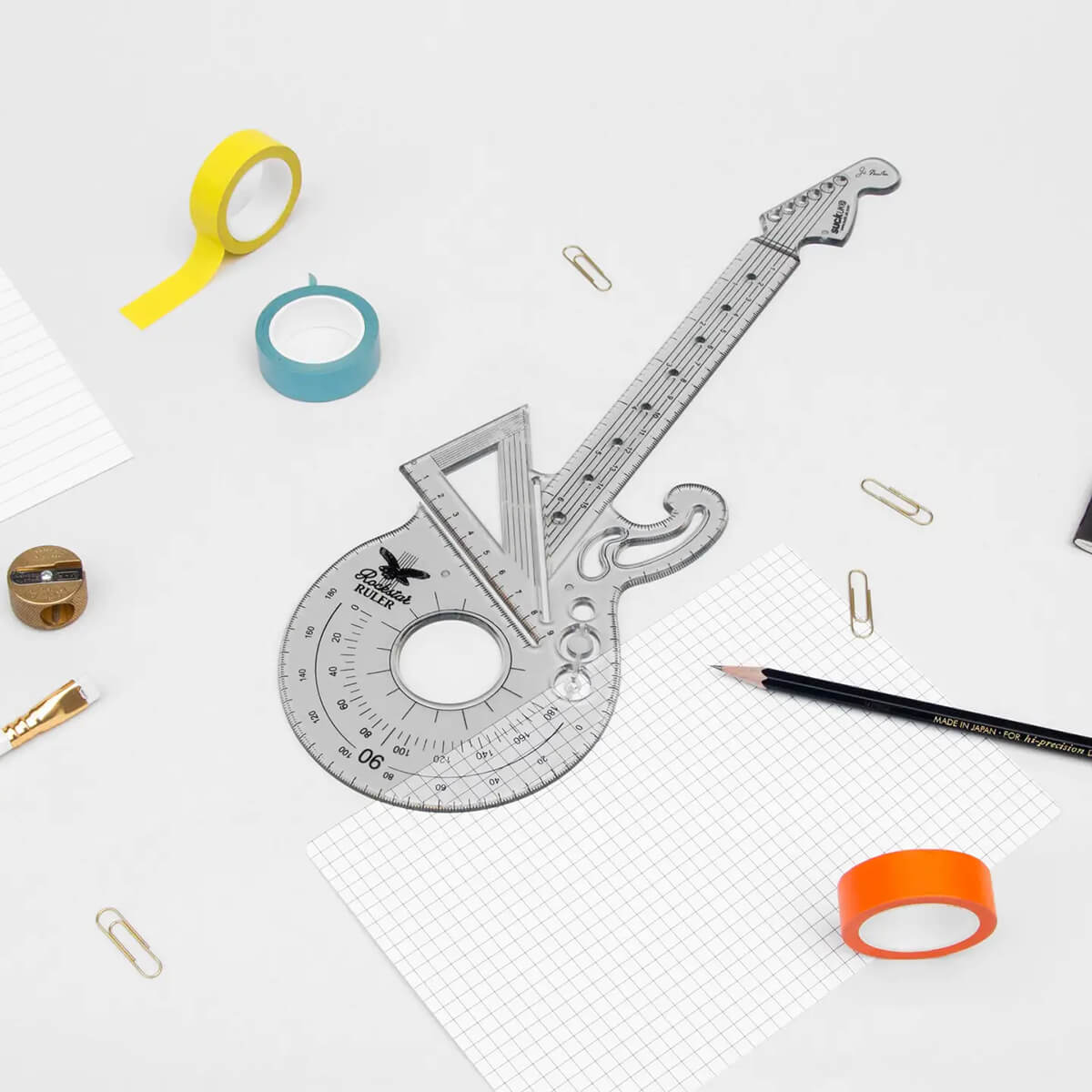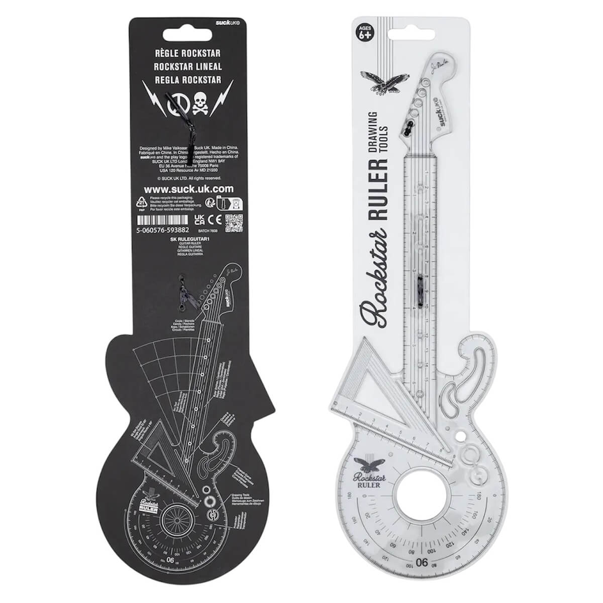 Rockstar ruler by Suck UK. Create great lines & smooth curves. Be the coolest kid in school and be prepared to rock out at any occasion with this multi-purpose and multi-use ruler. With inbuilt set square, protractor, arc tool and circular stencils you will be able to get through any math equation, solo.