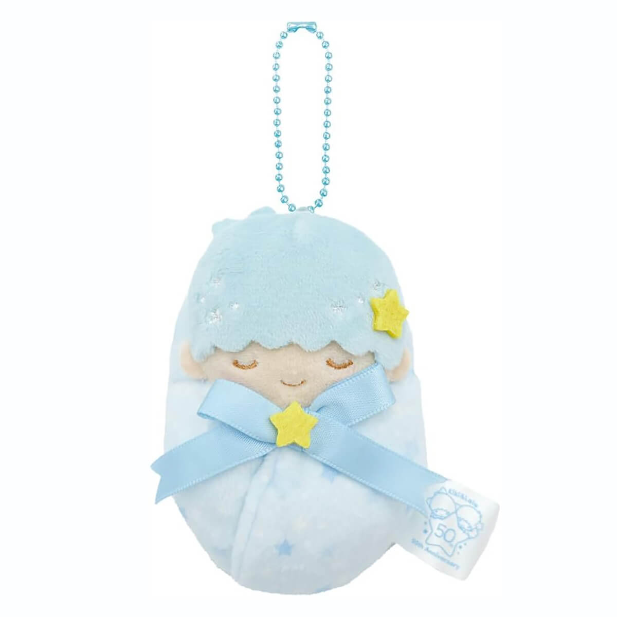 Little Twin Stars Kiki in a Swaddle Keychain by Sanrio. 50th Anniversary plush keyring featuring Little Twin Stars Kiki tucked up to sleep in a cosy swaddle.