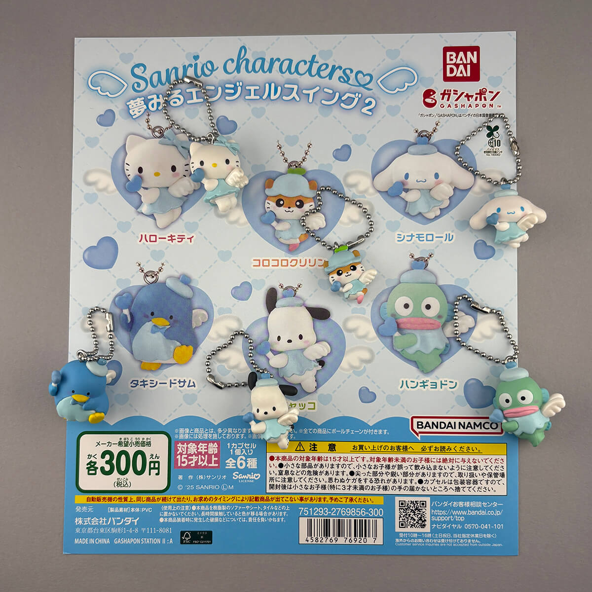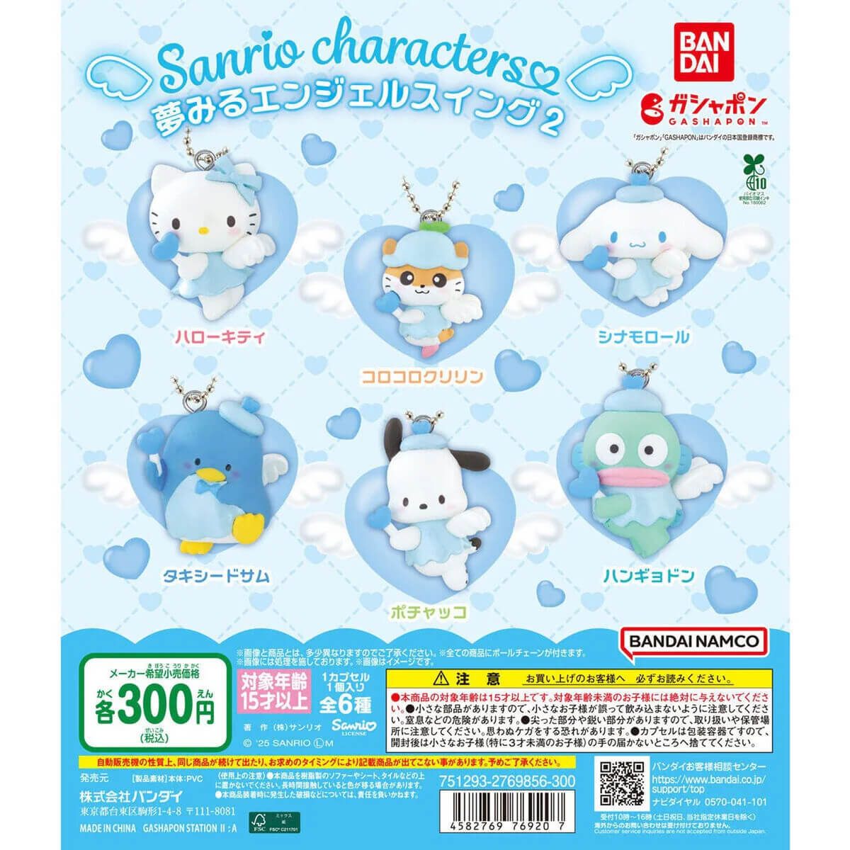 Sanrio Characters Dreaming Angel Swing Vol. 2 Gachapon Capsule Collectible by Bandai. Highly collectible and authentic Japanese gachapon capsule containing one of six Sanrio characters in angel form, on a ball chain to hang wherever you need a special angel mascot.