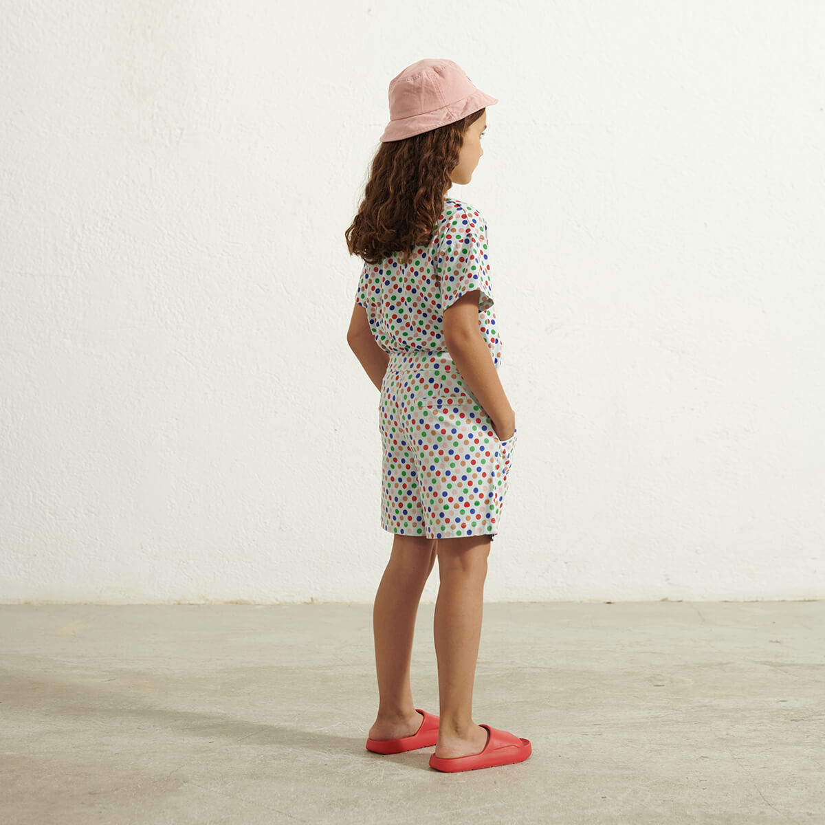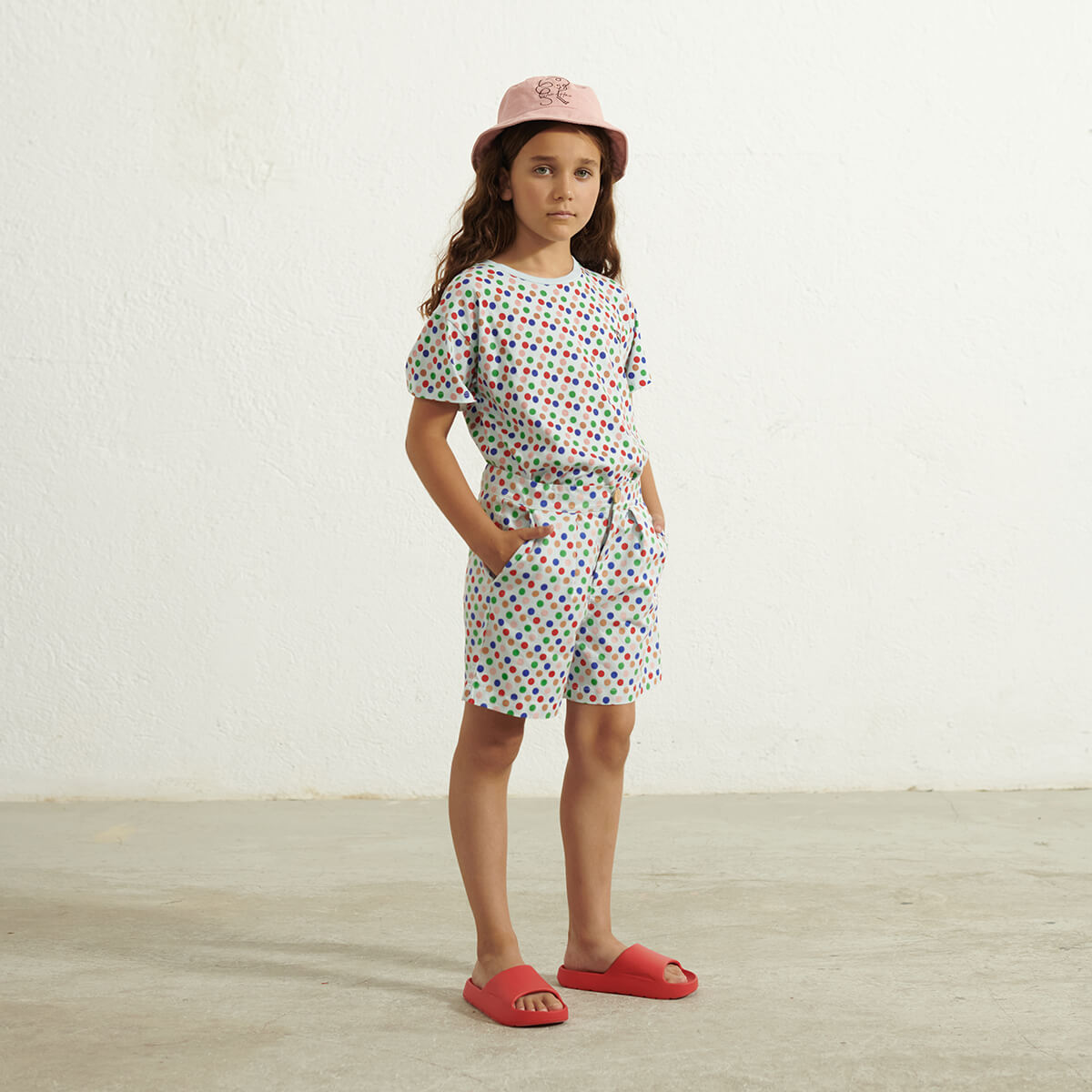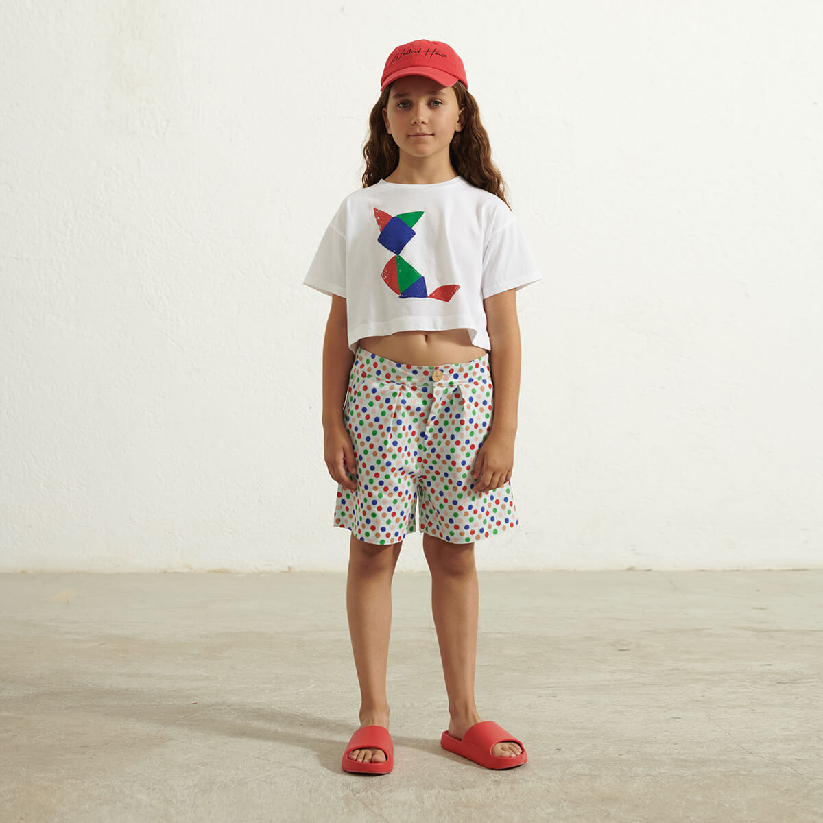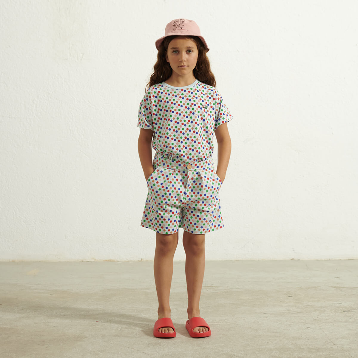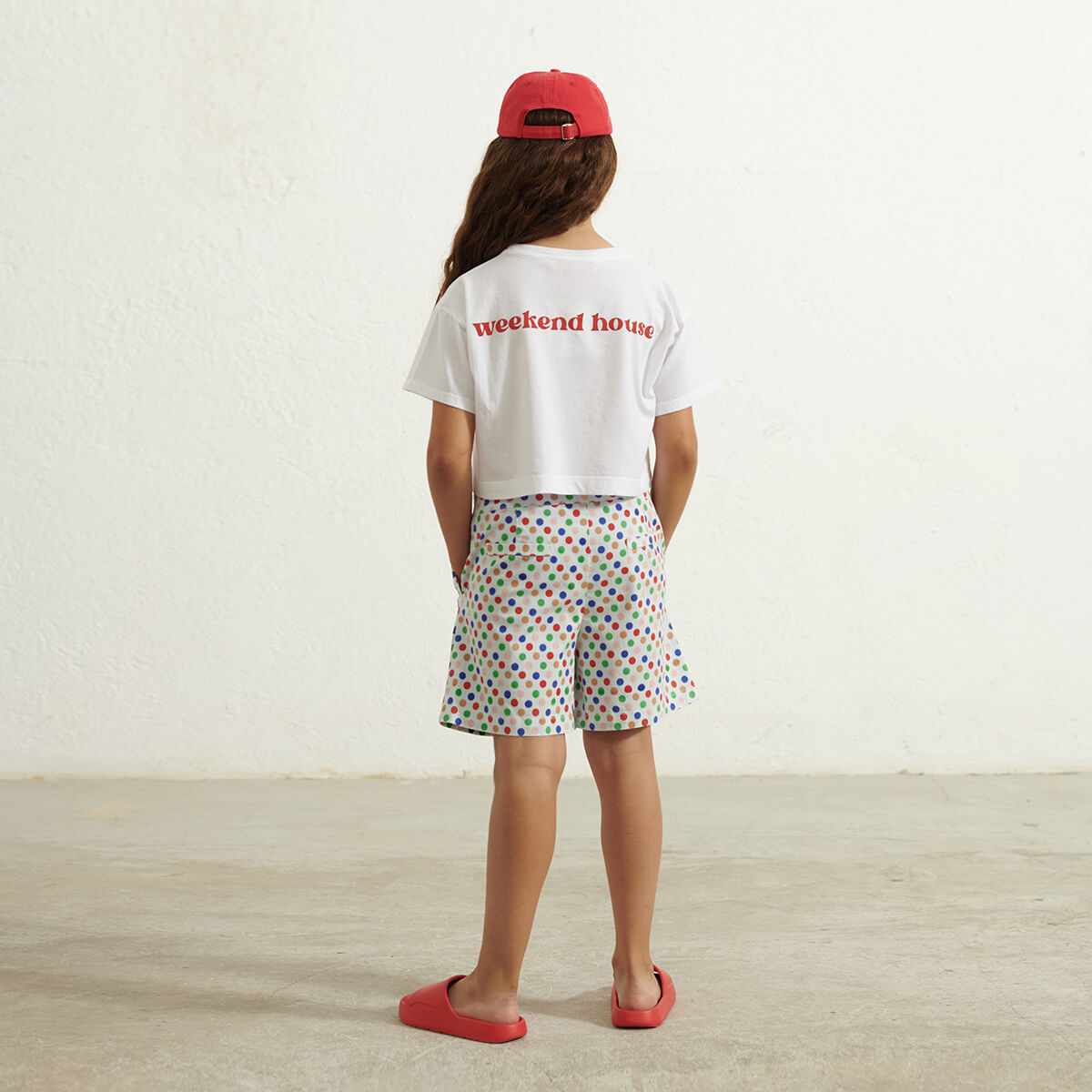 Dots bermuda shorts by Weekend House Kids. Longer length shorts with an adjustable waist, and side and back pocket detailing.
