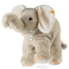 Trampili elephant by Steiff. This cute elephant measures an enormous 45cm and is made of cuddly soft woven fur. Trampili is stuffed with lightweight material but he can still strut clumsily through life. Cuddling and playing - that’s what Trampili loves doing. Trampili has the stainless steel Steiff "Button in Ear".