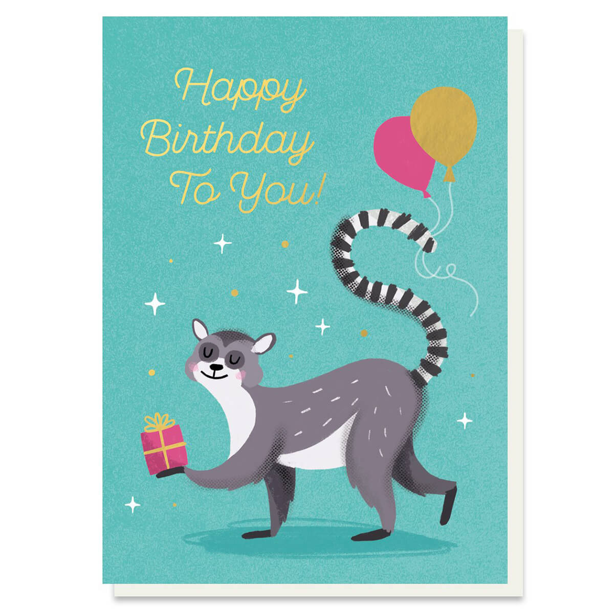 Birthday Lemur Greetings Card by Stormy Knight. Features a sweet illustration by Sarah Jackson, founder of Stormy Knight. Finished with satin gold foil details. Blank inside with FSC approved pearl envelope.