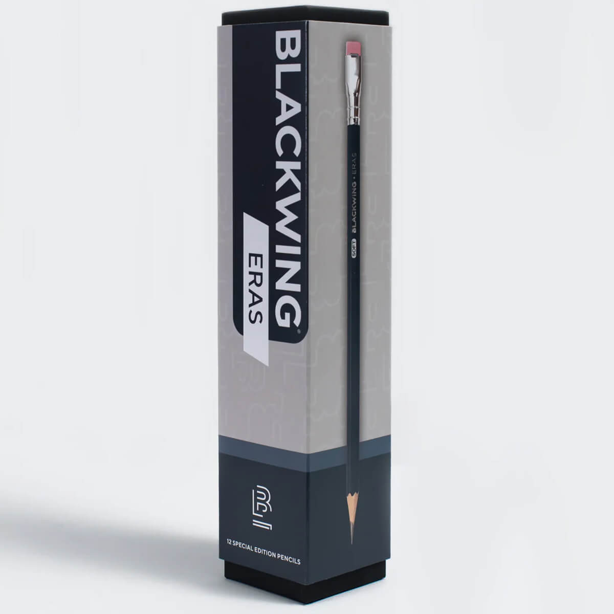 Box of 12 Blackwing Eras limited edition 2024 deep blue pencils by Blackwing. Blackwing Eras limited edition 2024 deep blue pencil by Blackwing. The 2024 Eras pencil sports a retro design inspired by the Microtomic 603. Each box includes 12 special edition pencils with a deep blue barrel, silver imprint and ferrule, a pink eraser, and Blackwing's soft graphite.
