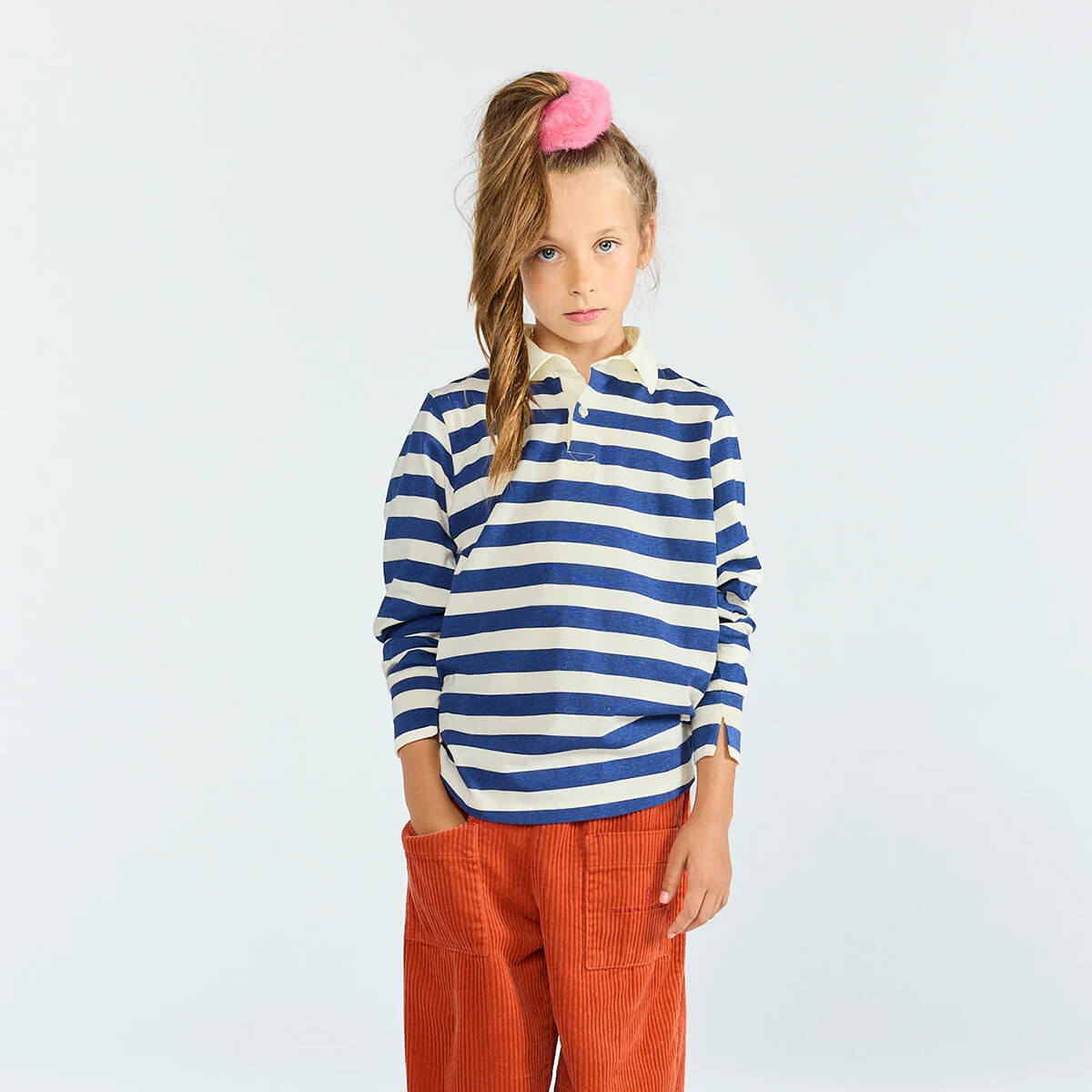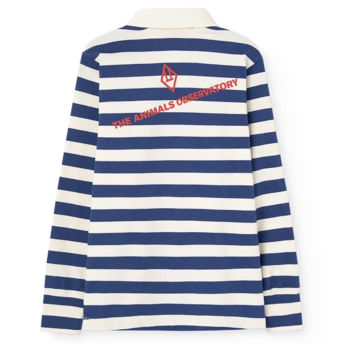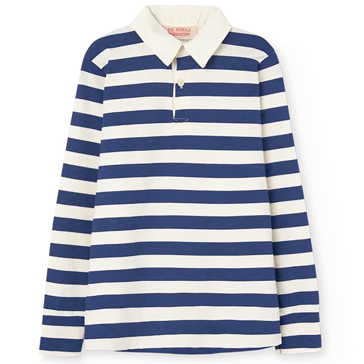Eel Kid Polo Shirt by The Animals Observatory. Navy stripes and The Animals Observatory bright logo feature on this vibrant long sleeved polo shirt.