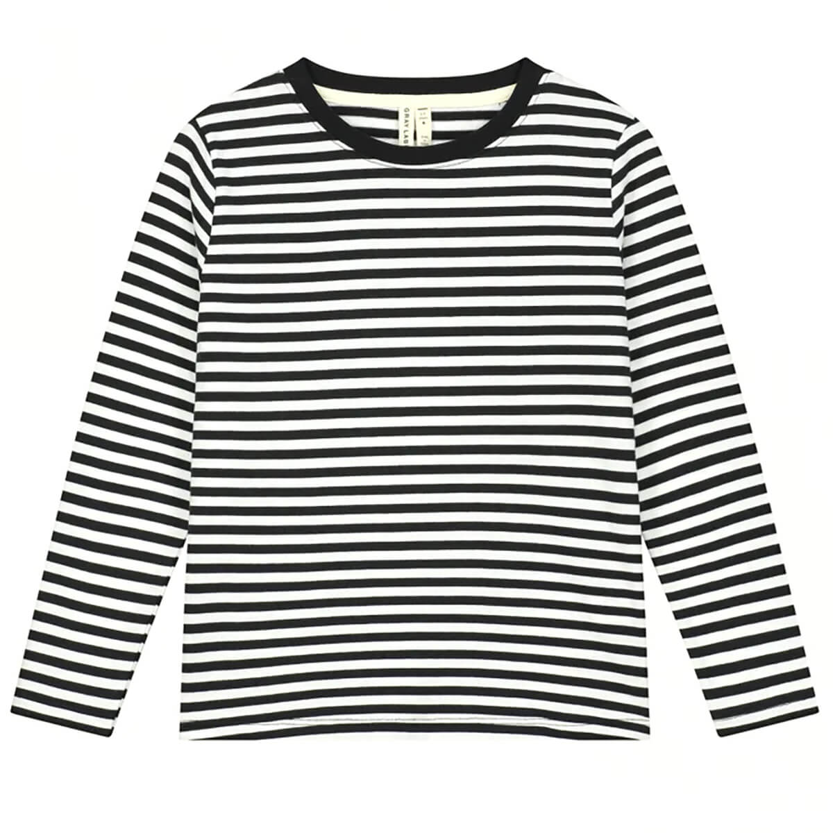 Long sleeve tee by Gray Label. This long-sleeved striped T-shirt is made from soft organic cotton jersey. A slip-on style in a classic stripe, it has a ribbed round neck, neat topstitching and rounded hem. Gray Label logo is stitched on the side of the right arm, just below the shoulder.