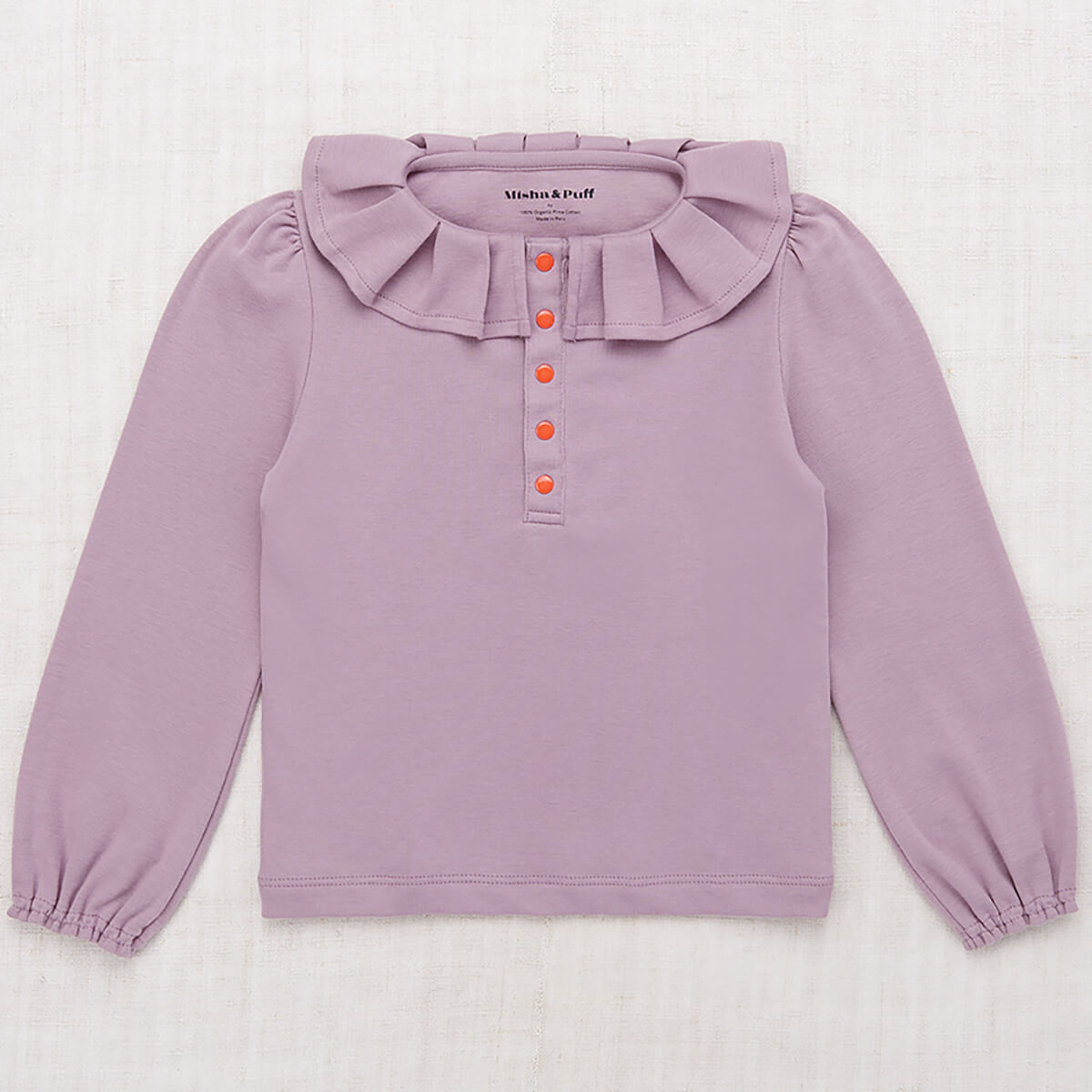 Ulla Top by Misha & Puff. A long-sleeved top in Pima cotton, featuring blouson sleeves with a soft elastic cuff, a pleated collar, and partial snap button closure. A great style for layering.
