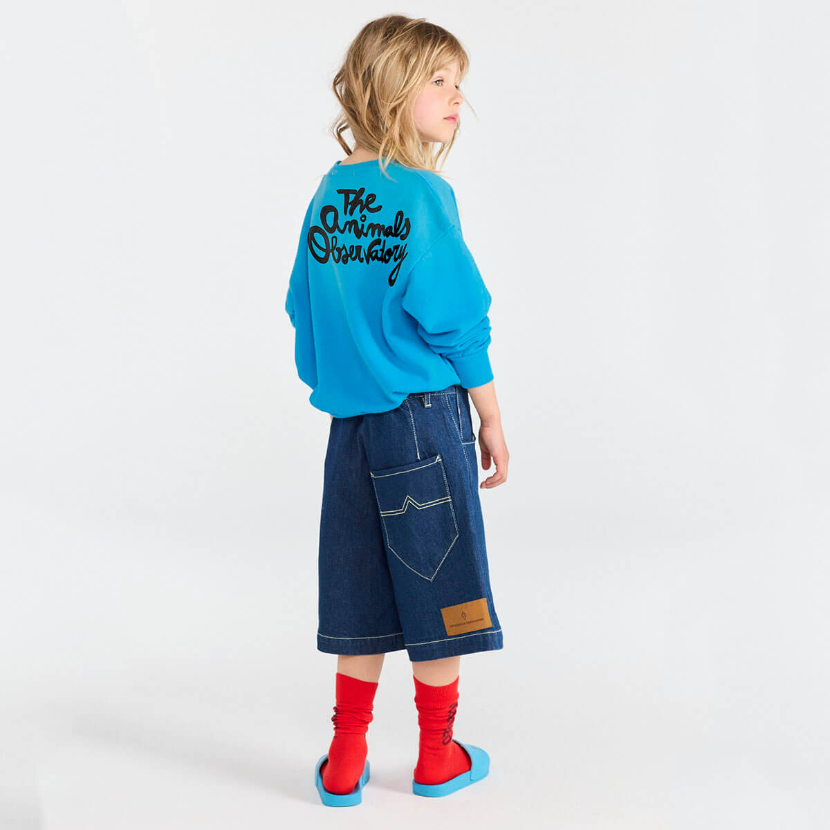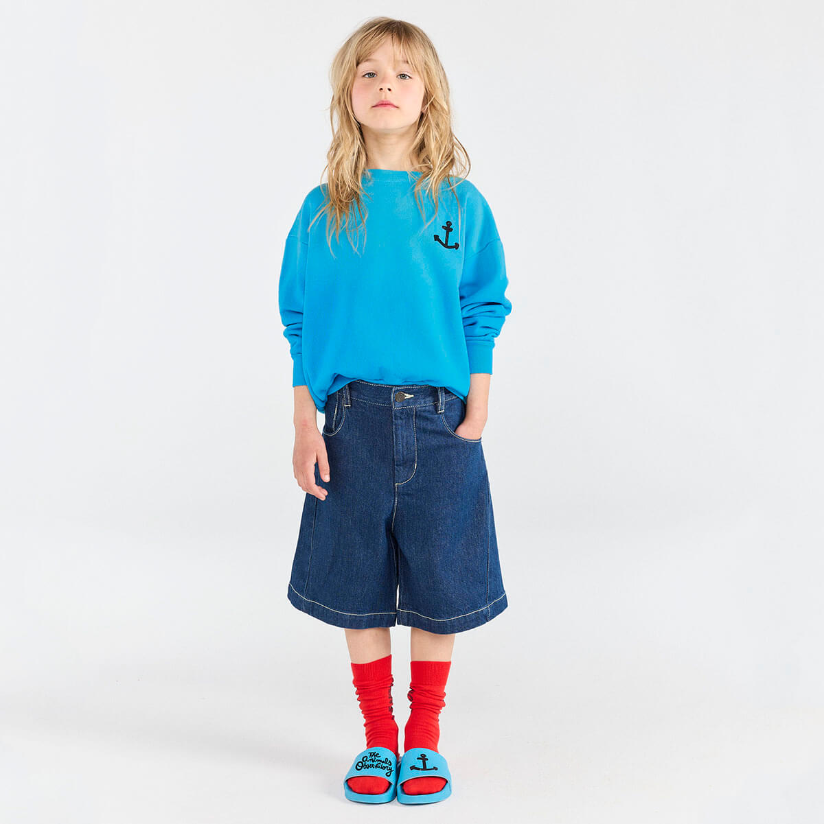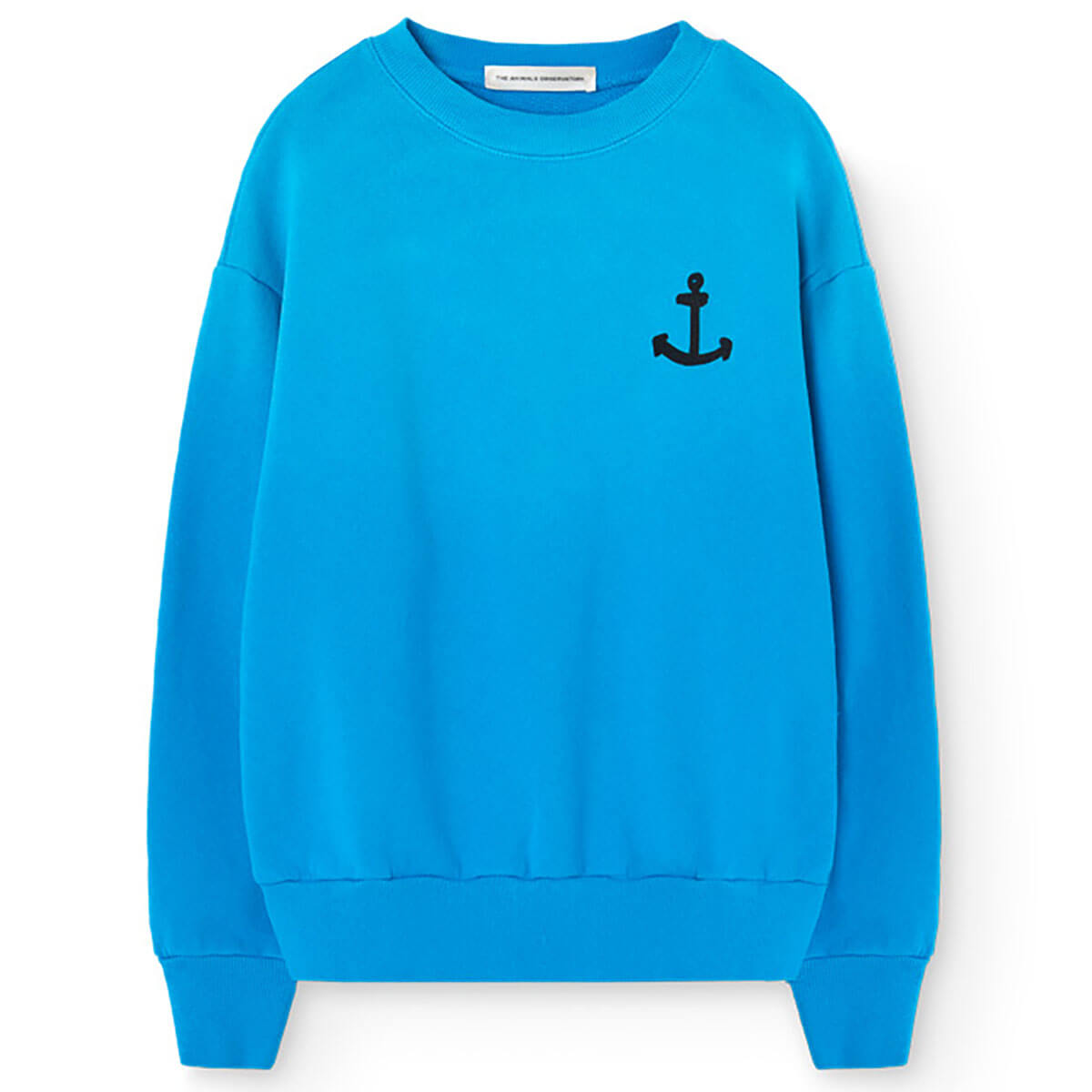 Bear Kid Sweatshirt by The Animals Observatory. This blue sweatshirt features a small anchor on the chest and bold lettering on the back, delivering nautical-inspired clothes with a graphic twist. Its unique finish creates water-effect variations, making every sweatshirt truly one of a kind. It offers a perfect fabric for summer with unbrushed fleece.