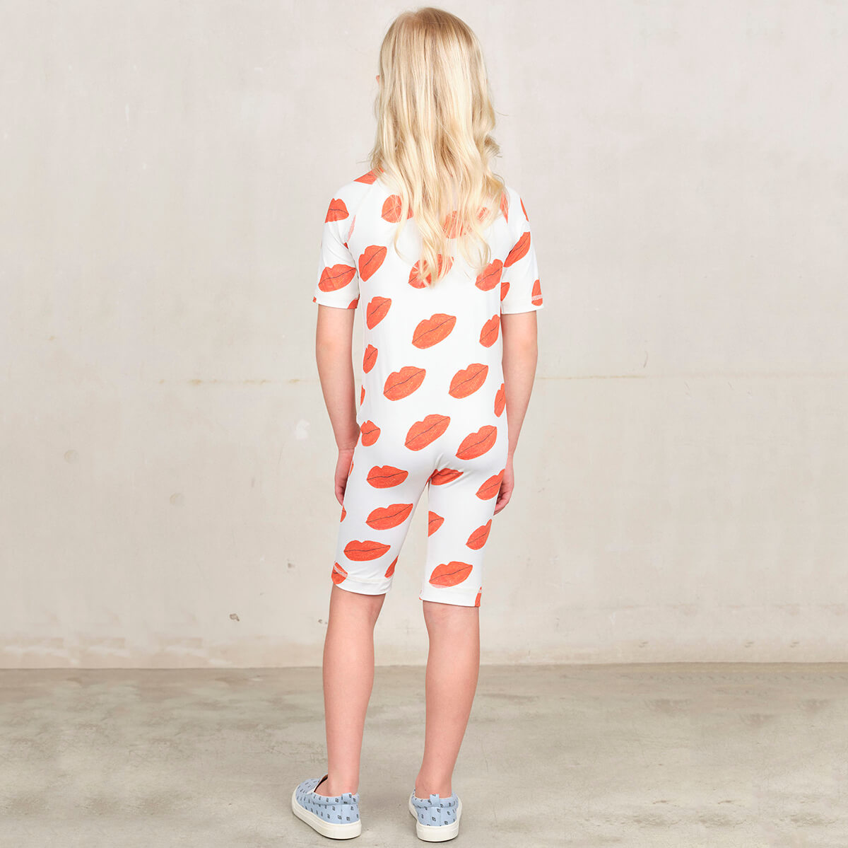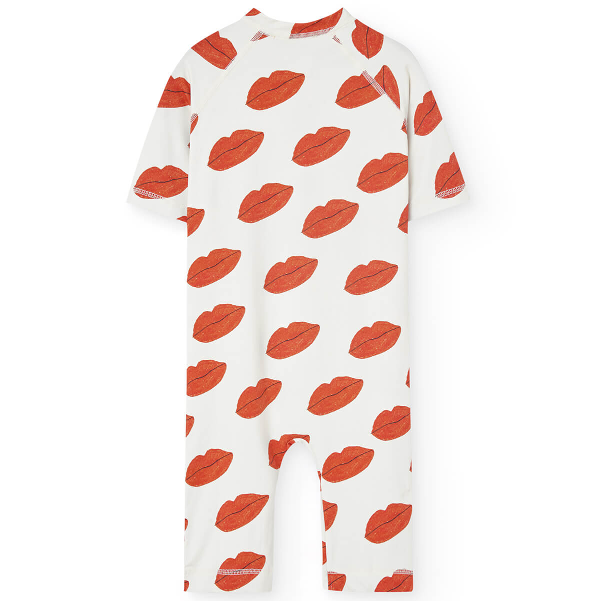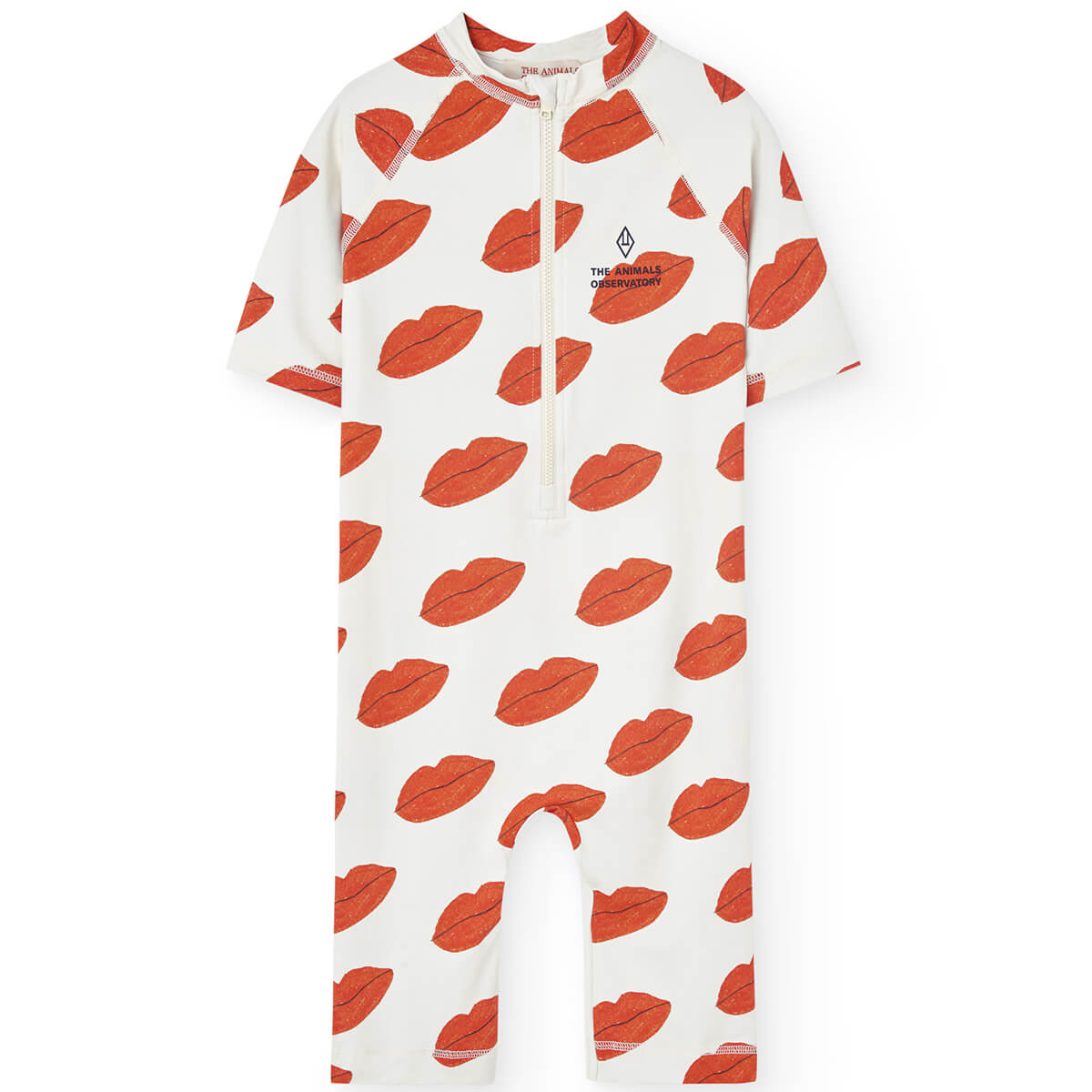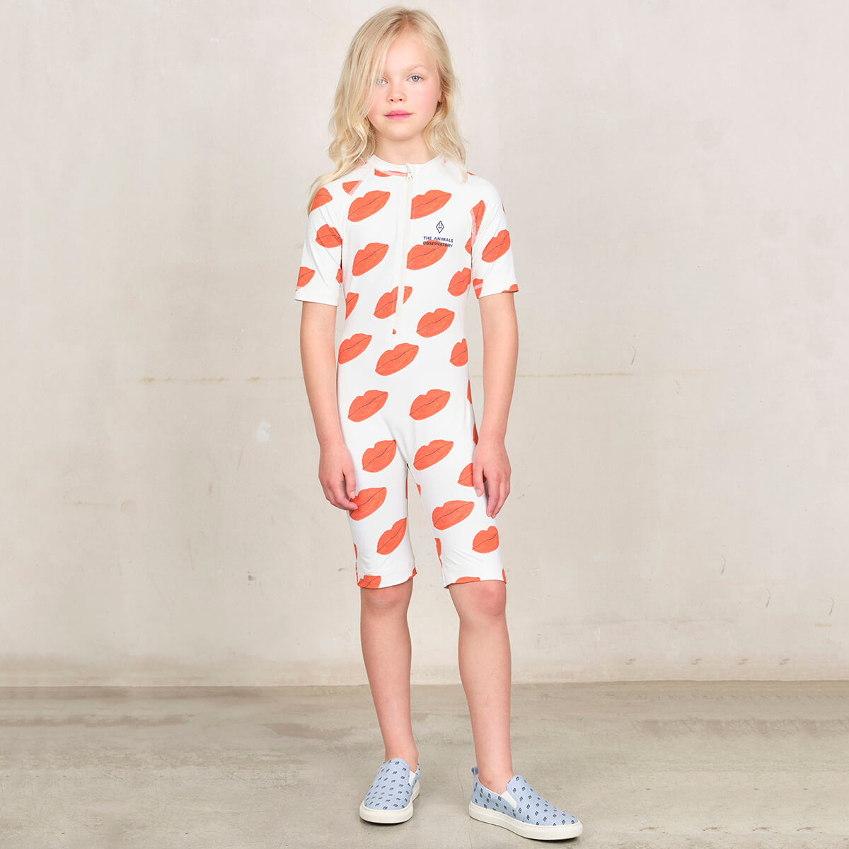 Caterpillar Kids Swimsuit by The Animals Observatory. Complete swimsuit with an orange kissing print. Fun and bright, perfect for poolside fun. UPF +50.