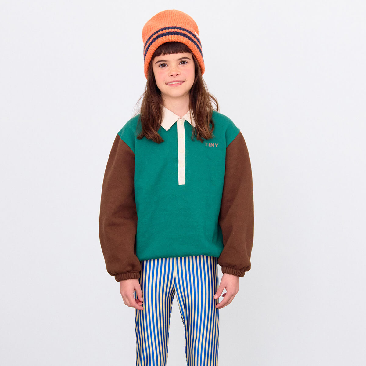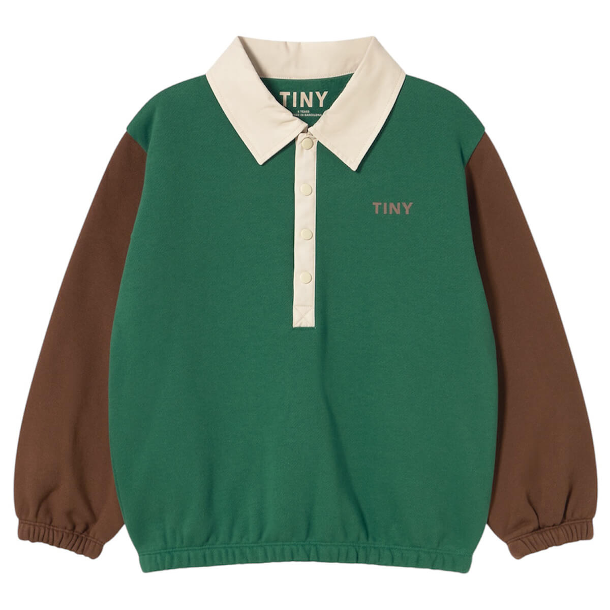 Colour Block Sweatshirt by Tinycottons. This colour block sweatshirt is crafted from 100% organic cotton and features a comfortable silhouette with elasticated hems, long sleeves, and a polo neck. The half-front snap-button opening adds practicality without compromising style. Perfect for casual outings or cozy days at home, it offers quality, comfort, and a modern edge.