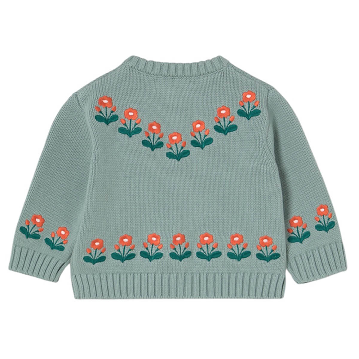 Flowers Baby Cardigan by Tinycottons. This embroidered flowers baby cardigan, crafted from a soft cotton and wool blend, adds a playful touch to any little wardrobe. Featuring a button-up front and cozy feel, it combines comfort and style—perfect for your baby’s daily adventures.
