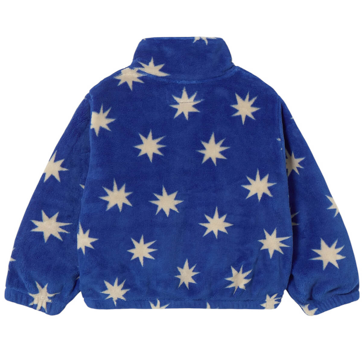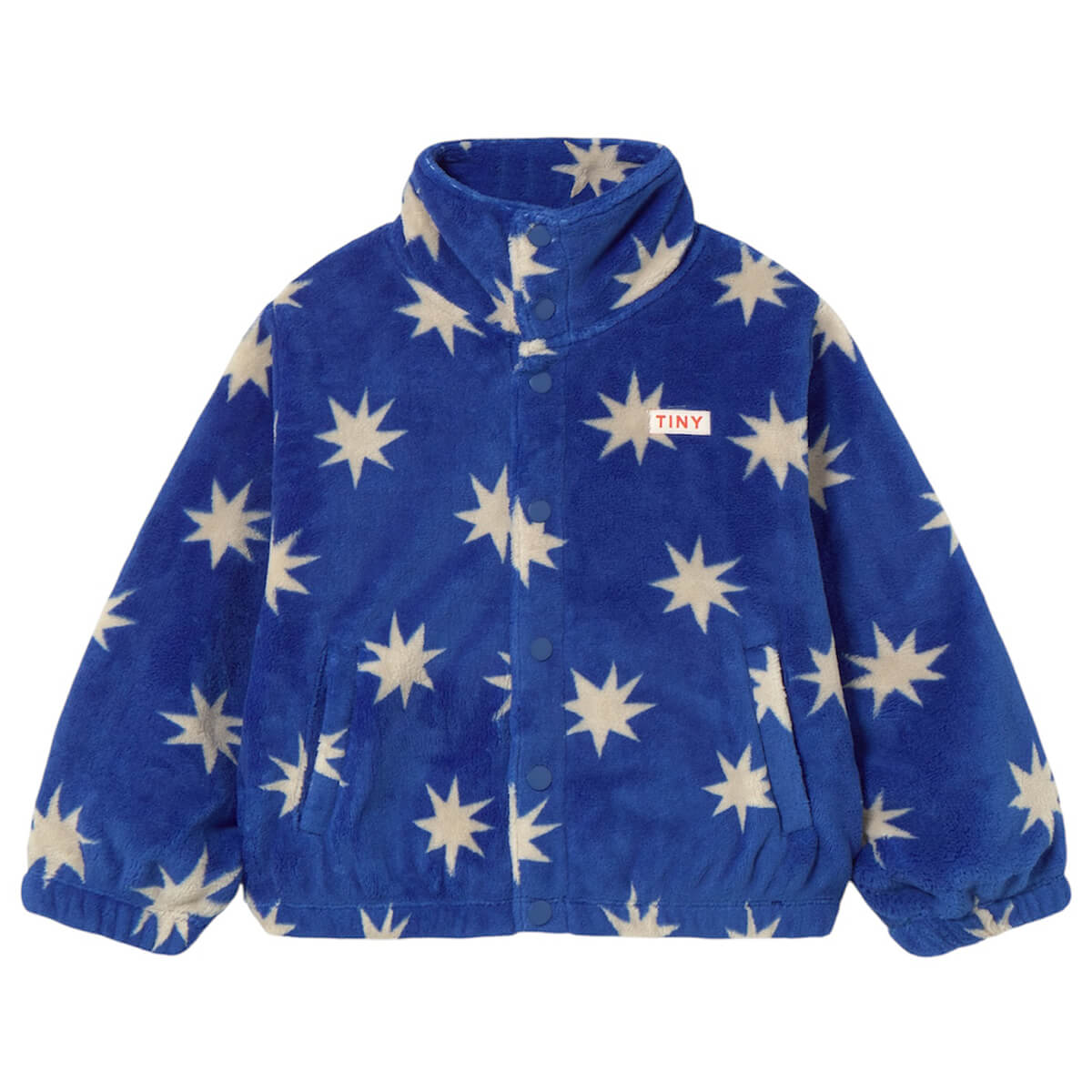 Stars Polar Jacket by Tinycottons. This soft polar fleece jacket with a stars print features a full snap-button front closure, high neckline, elasticated hems, and practical front pockets for added convenience. It’s a seasonal staple, perfect for keeping little ones cosy and stylish during the first chilly days of fall and winter.
