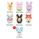 Each blind box contains one character. Each collectible is wrapped in an individual foil bag. Paper insert listing all of the characters in this collection is included. Characters in this series include: Galaxy Hopper (glow in the dark feature!), Berry Bunny, Petal Gym Bunny, Sunny Bunnie, Magic Hopper, Blossom Bunnie, Snow Bunny (chaser!)