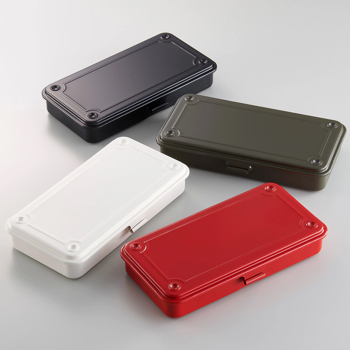 T-192 Trunk shape tool box by Toyo Steel. The T-192 is two-thirds the thickness of the existing T-190 series and ideal for smaller stationery items, especially pens. Made in Osaka since 1969, these tool boxes are a stylish addition to any desk. Holds small stationery items, sandwiches and little toys. Stackable with other Toyo Steel trunk shape tool boxes (T-190 and T-192) and available in a variety of colours.