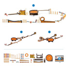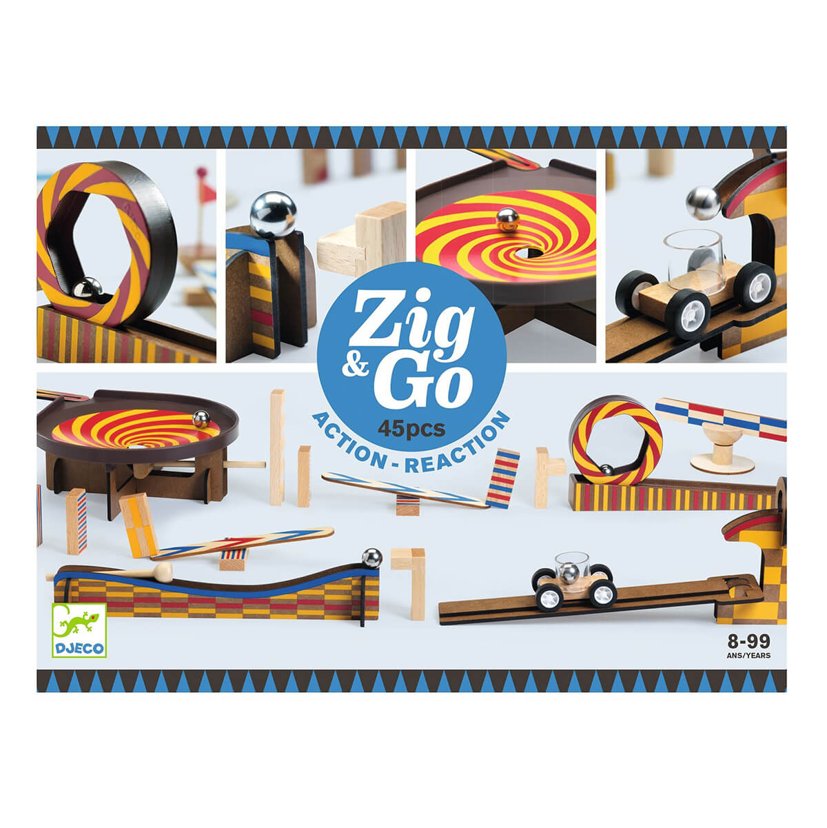Zig and Vroom 45 Pieces by Djeco. A large 45 piece wooden chain reaction puzzle and construction set. This 45 piece set with wooden dominoes, ball and components will inspire creativity and build skills like perseverance. The child follows the 3 models in the booklet to build their journey or imagine others endlessly. This game for ages 8 and up is compatible with all the boxes in the collection to invent even more ingenious action-reaction courses.