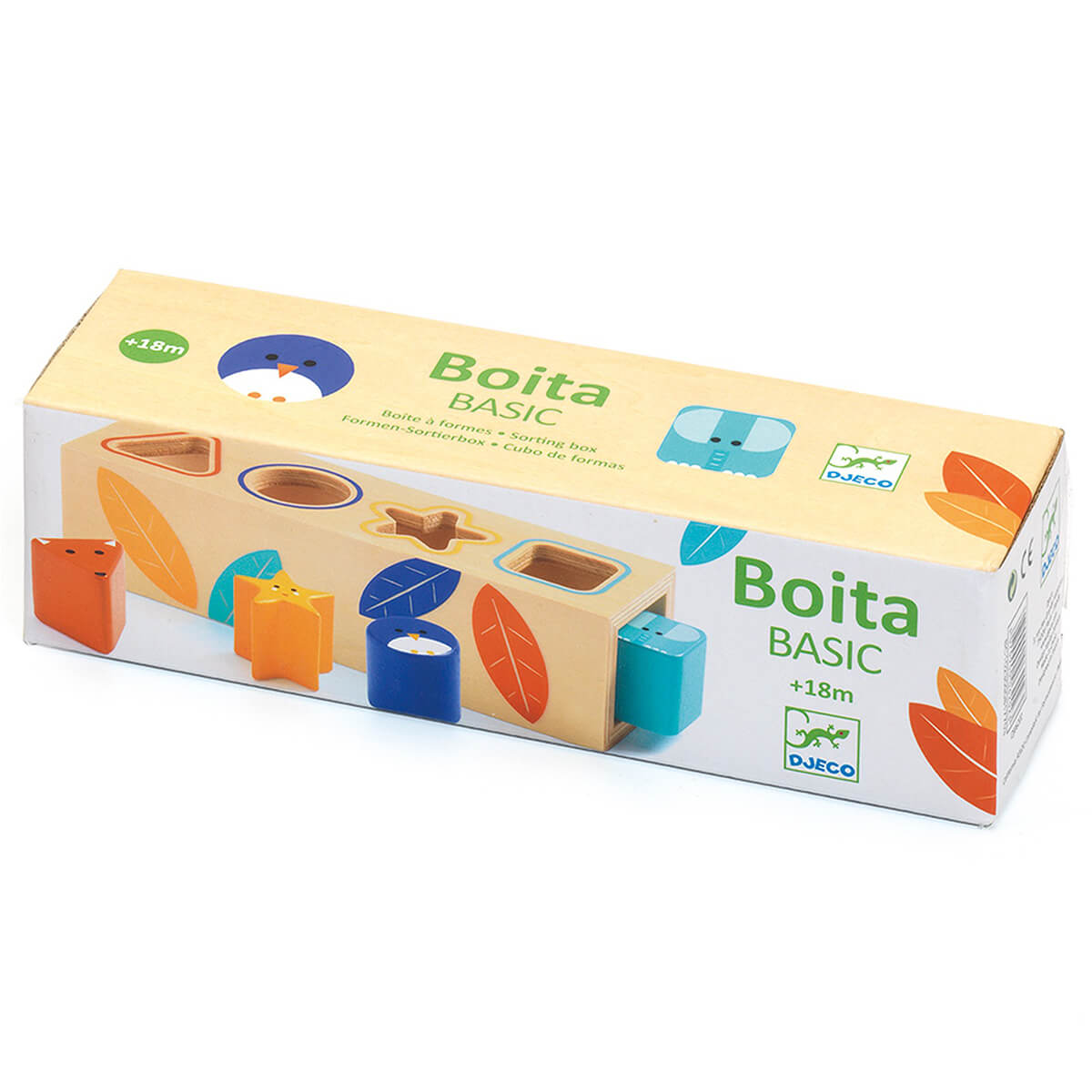BoitaBasic wooden shape sorter by Djeco. Wooden box shaped shape sorter with four different shapes - circle, triangle, square and star, each with sweet faces. Educates toddlers about geometric shapes, from 18 months. The child has fun placing the 4 pieces in the corresponding hole. The pieces are then collected easily from the sides of the box to start again.
