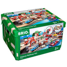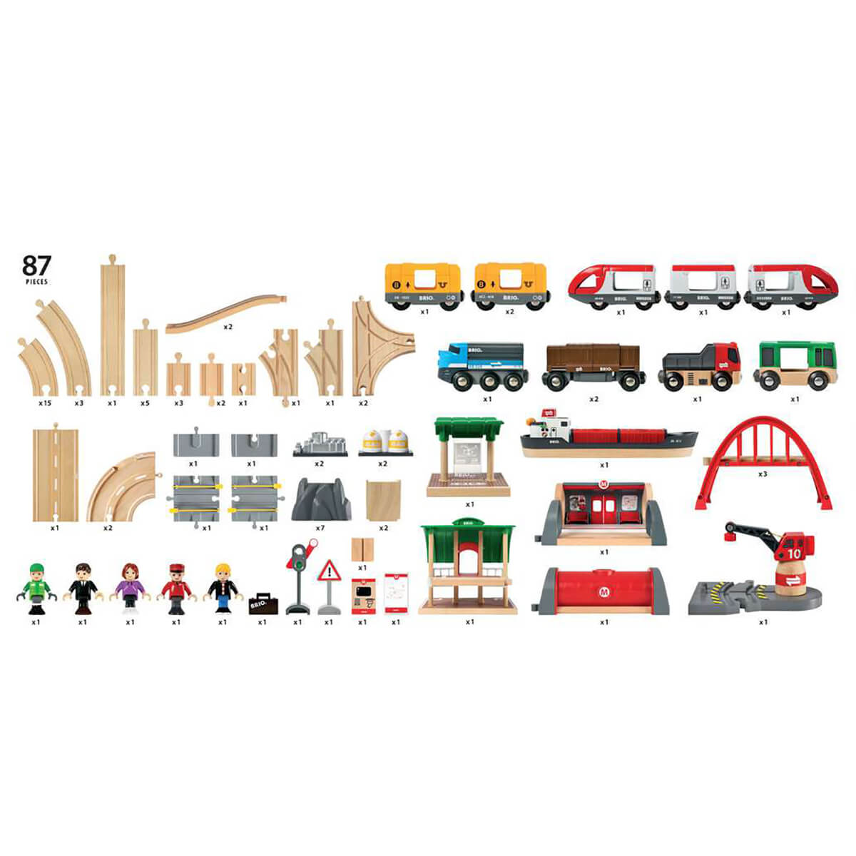 Railway set by Brio. The ultimate Brio World rail and road set – this 87-piece Deluxe Railway Set comes complete with passenger trains, freight trains, harbor and metro scenes, stations, cranes, bridges, road and rail tracks, figures and more. Full of action and adventure, this Brio World set helps children explore the world around them in a fun and educational way.