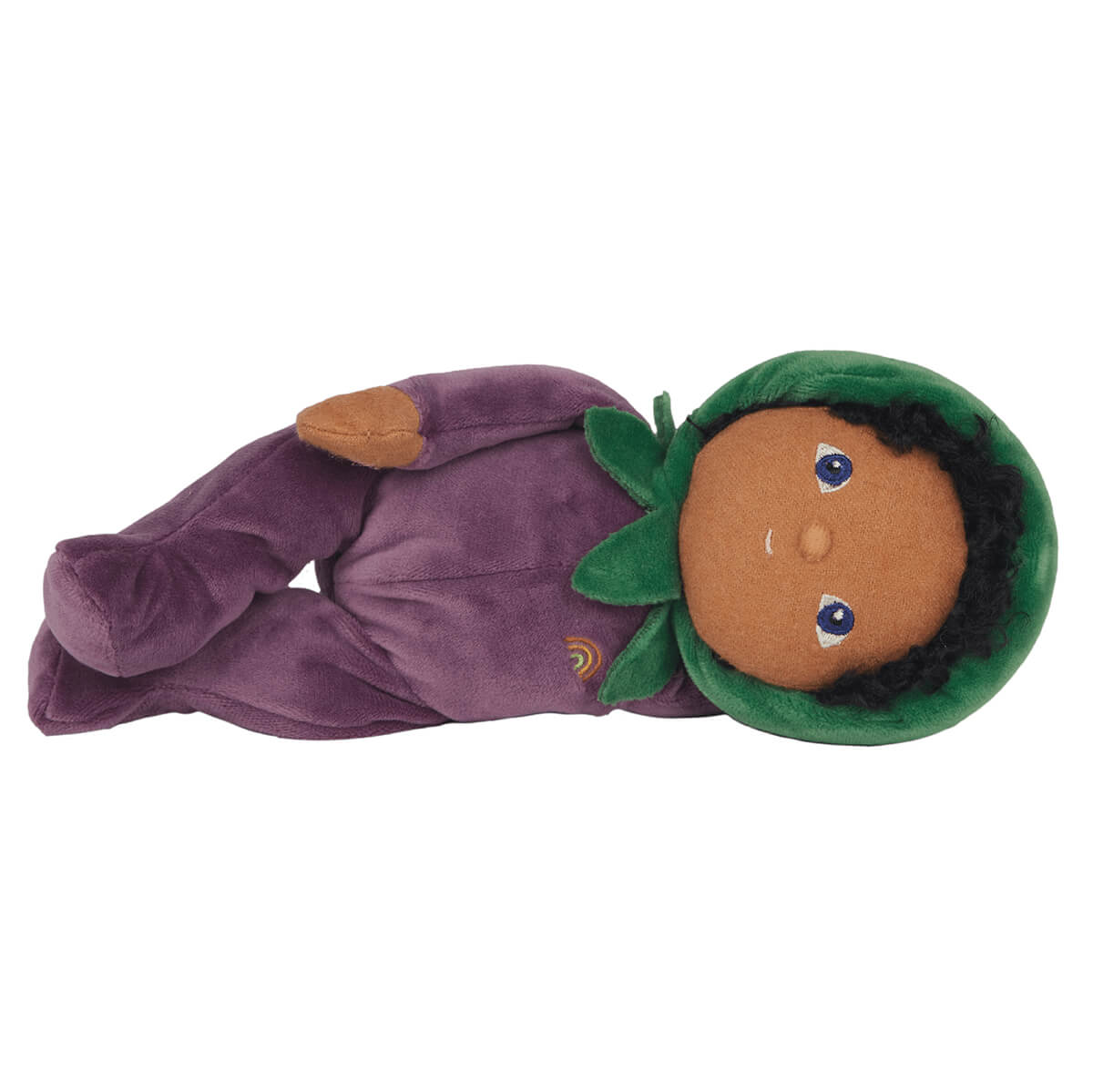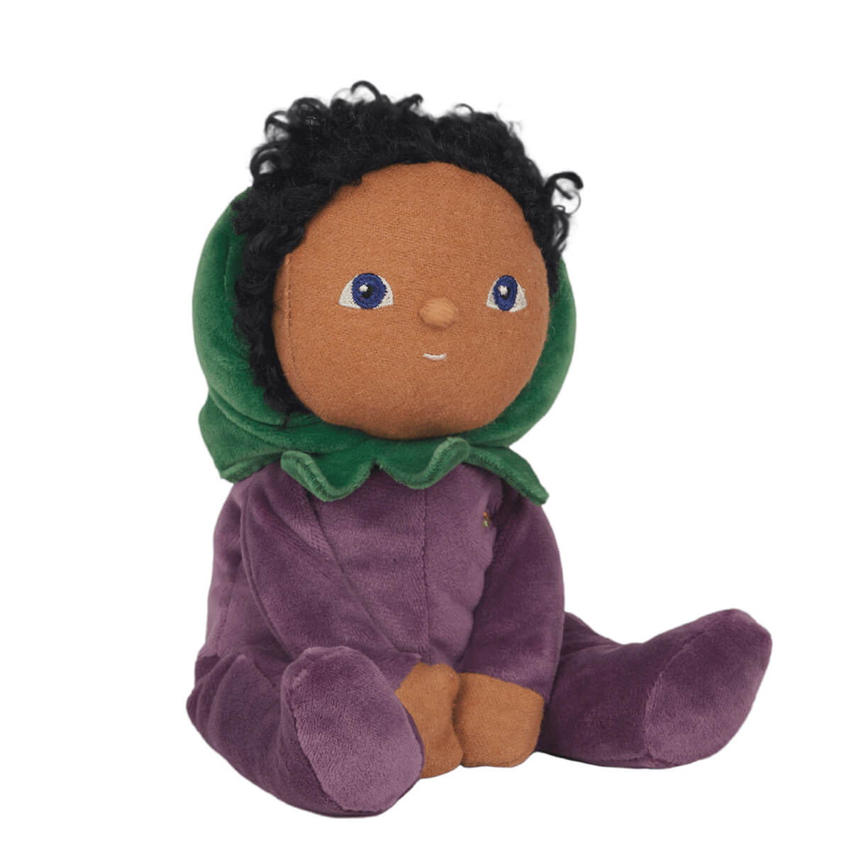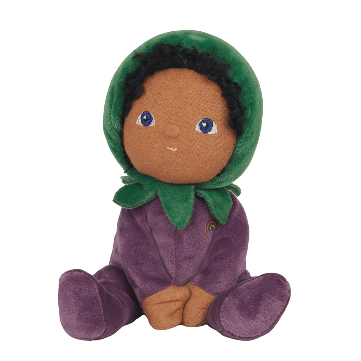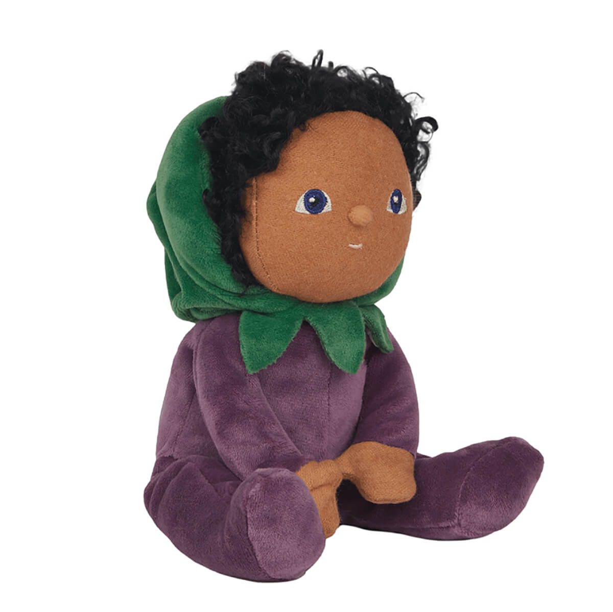 Ellis Eggplant Happy Harvest Dinky Dinkums Doll by Olli Ella. With his deep purple romper and adorable little hood, Ellis is a true standout in the garden patch. It's not hard to fall in love with Ellis.