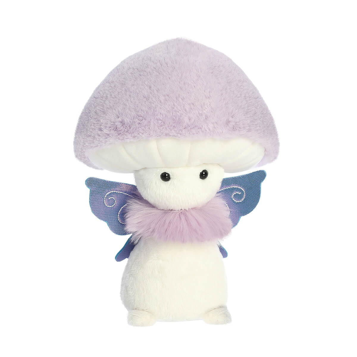 Fairy Fungi Friends Soft Toy by Aurora. This enchanting mushroom is part of the magical Sparkle Tales Fungi Friends collection by Aurora. Made from a super soft plush, and topped off with a fluffy lilac mushroom cap. She has sweet little eyes with a charming expression, a fluffy ring, and cute little feet to stand on, as well as lilac embroidered fairy wings at the back which makes her irresistibly cute. Filled with eco-friendly recycled inner fibre and beans made from recycled plastic materials.