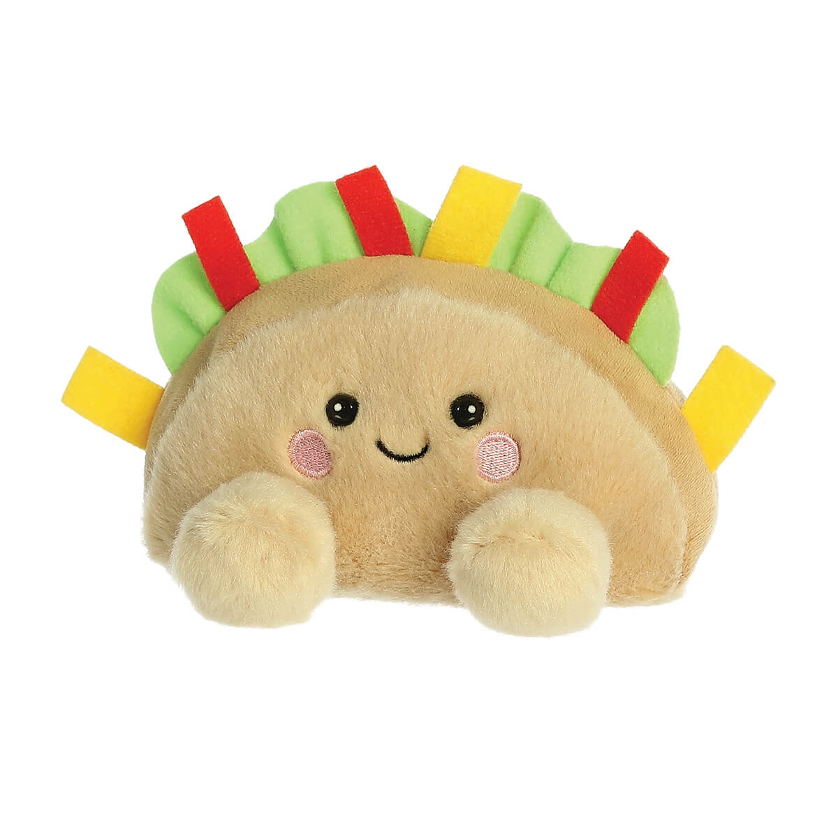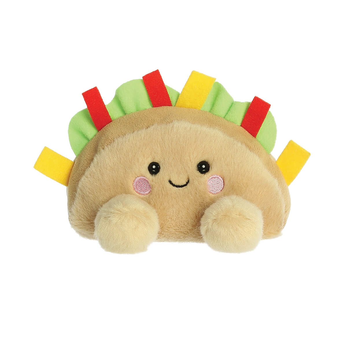 Fiesta Taco Palm Pal by Aurora. This cute taco fits into the palm of your hand and is full of beans which makes it super soft and cuddly. Fiesta Taco's body is a soft brown plush material with fabric taco fillings. Palm Pals make great gifts for any occasion. Suitable from birth.