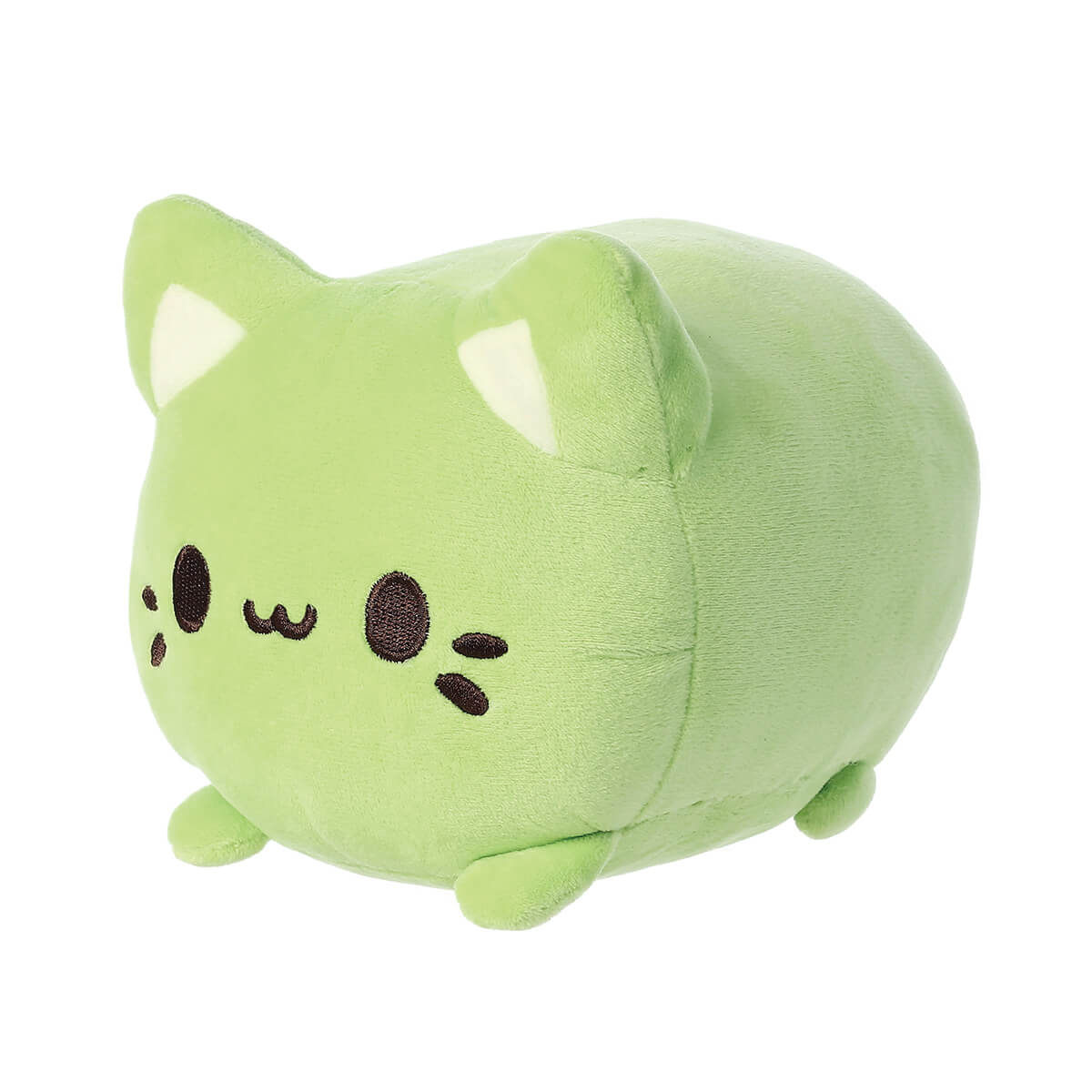 Green Tea Meowchi Soft Toy by Aurora. Adorable Green Tea Meowchi inspired by green tea, rice mochi dessert, and a kitty. From the kawaii-filled Tasty Peach collection by Aurora featuring Japanese-inspired desserts combined with adorable characters. Overstuffed and made from a super soft minky fabric with a sweet embroidered facial expression.