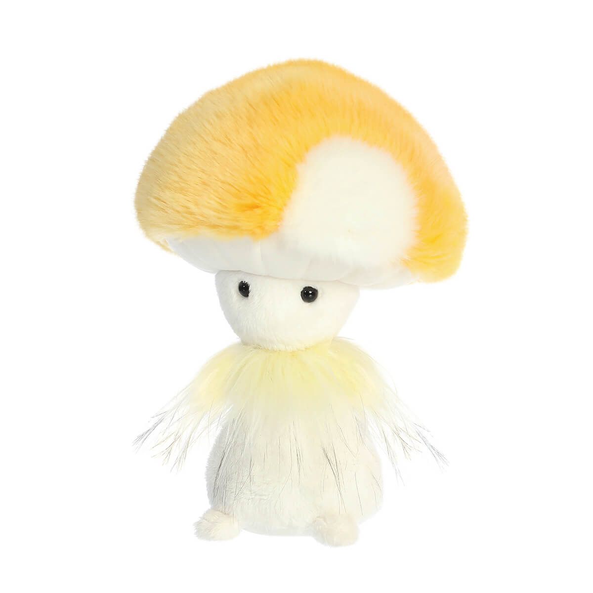 Honey Fungi Friends Soft Toy by Aurora. This enchanting mushroom is part of the magical Sparkle Tales Fungi Friends collection by Aurora. Made from a super soft plush, and topped off with a fluffy yellow and white mushroom cap. It has sweet little eyes with a charming expression, a fluffy ring, and cute little feet to stand on. Filled with eco-friendly recycled inner fibre and beans made from recycled plastic materials.
