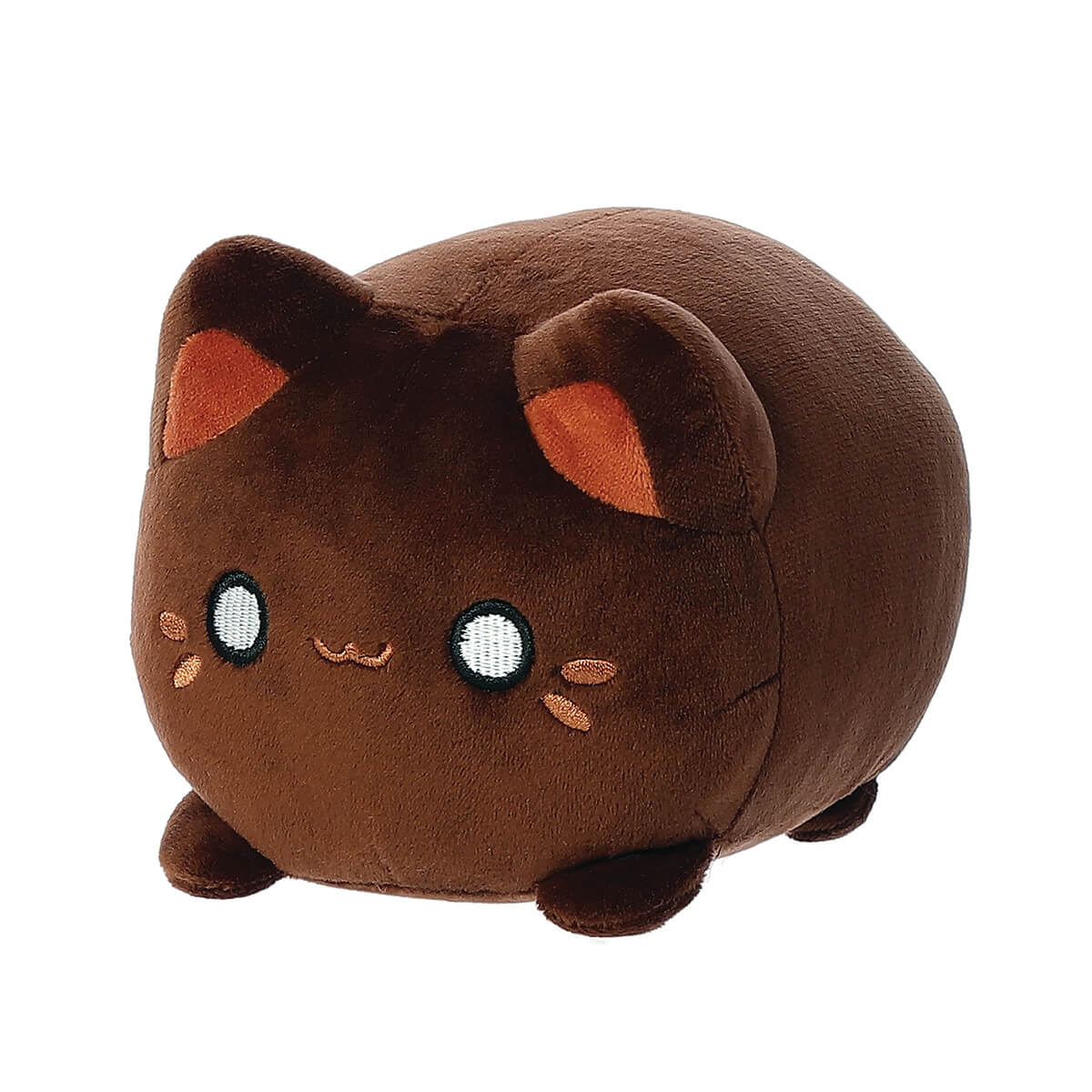 Kona Coffee Meowchi Soft Toy by Aurora. Adorable Kona Coffee Meowchi inspired by Kona coffee, rice mochi dessert, and a kitty. From the kawaii-filled Tasty Peach collection by Aurora featuring Japanese-inspired desserts combined with adorable characters. Overstuffed and made from a super soft deep velvety brown minky fabric with a sweet embroidered facial expression.