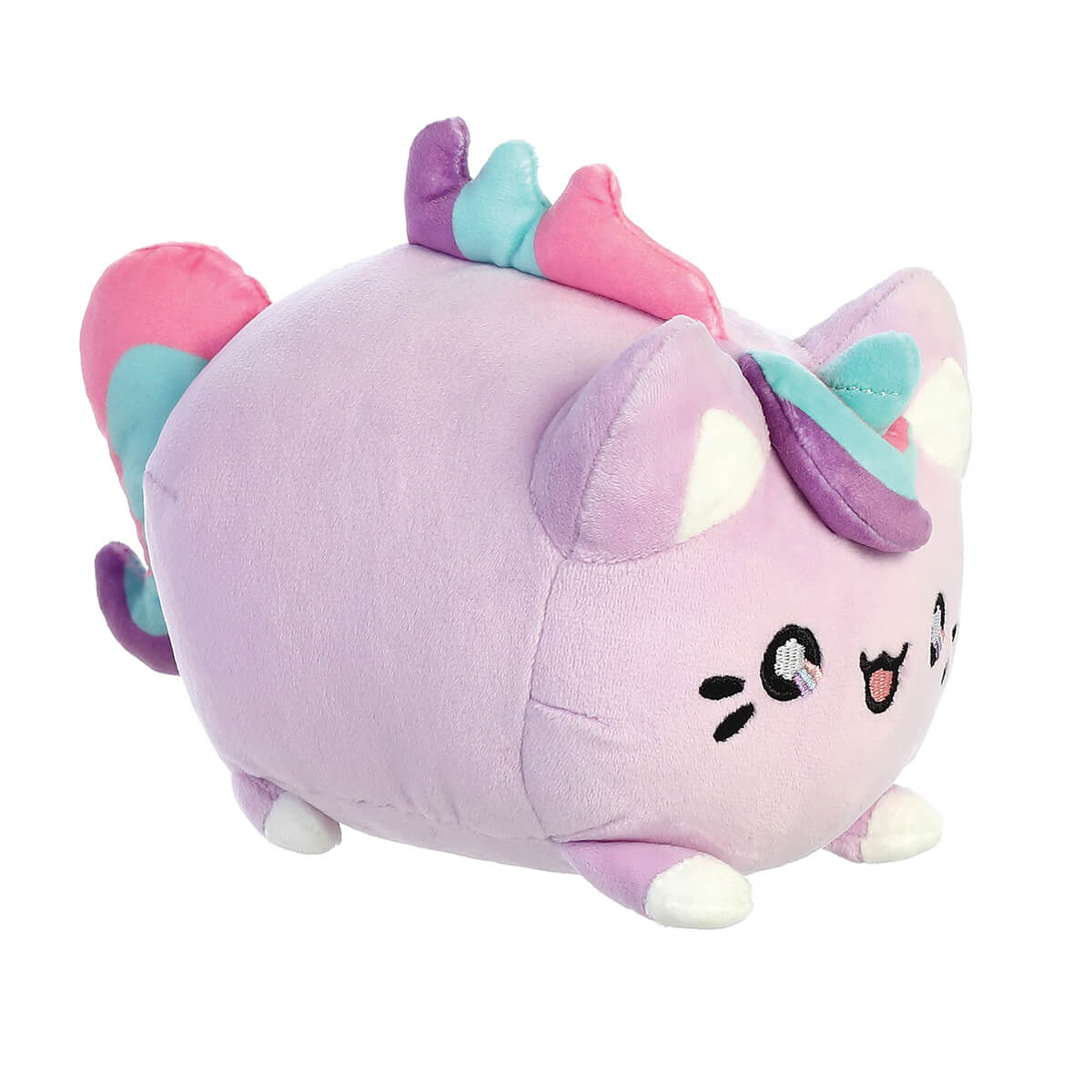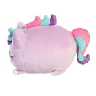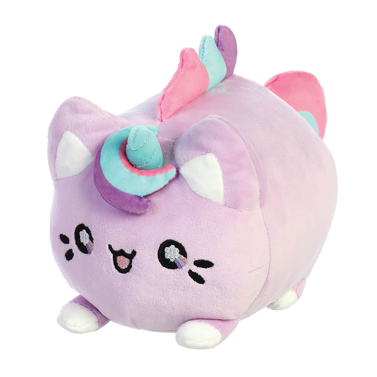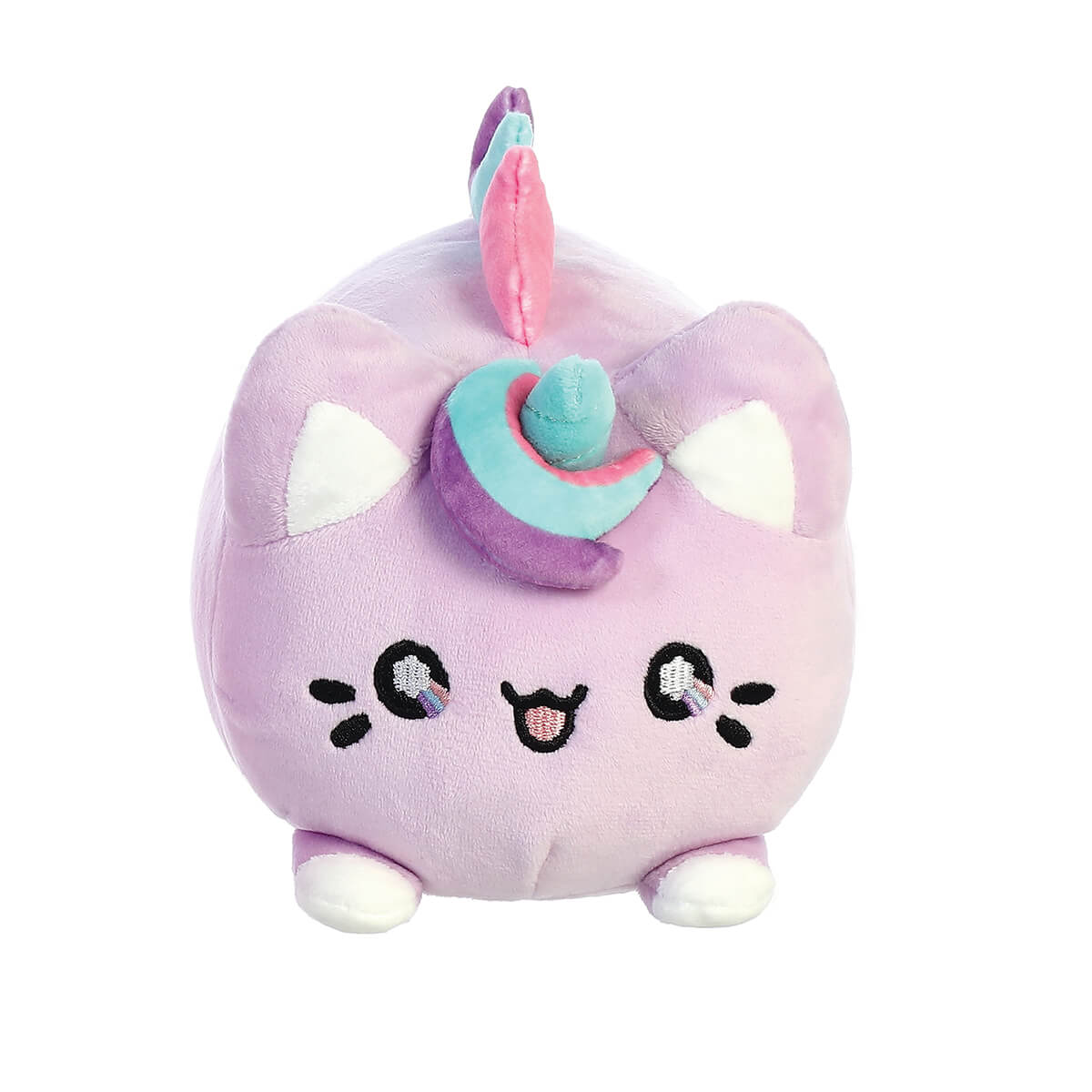 Lavender Dream Meowchi Soft Toy by Aurora. Adorable Lavender Dream Meowchi inspired by rice mochi dessert and a kitty. From the kawaii-filled Tasty Peach collection by Aurora featuring Japanese-inspired desserts combined with adorable characters. Overstuffed and made from a super soft lilac minky fabric with fantastical coloured swirls and a sweet embroidered facial expression.