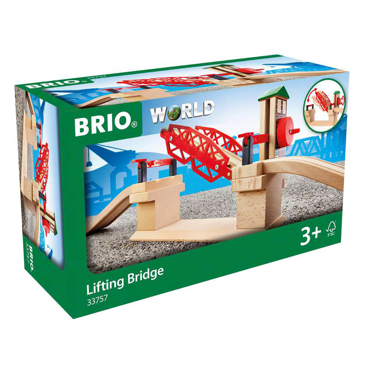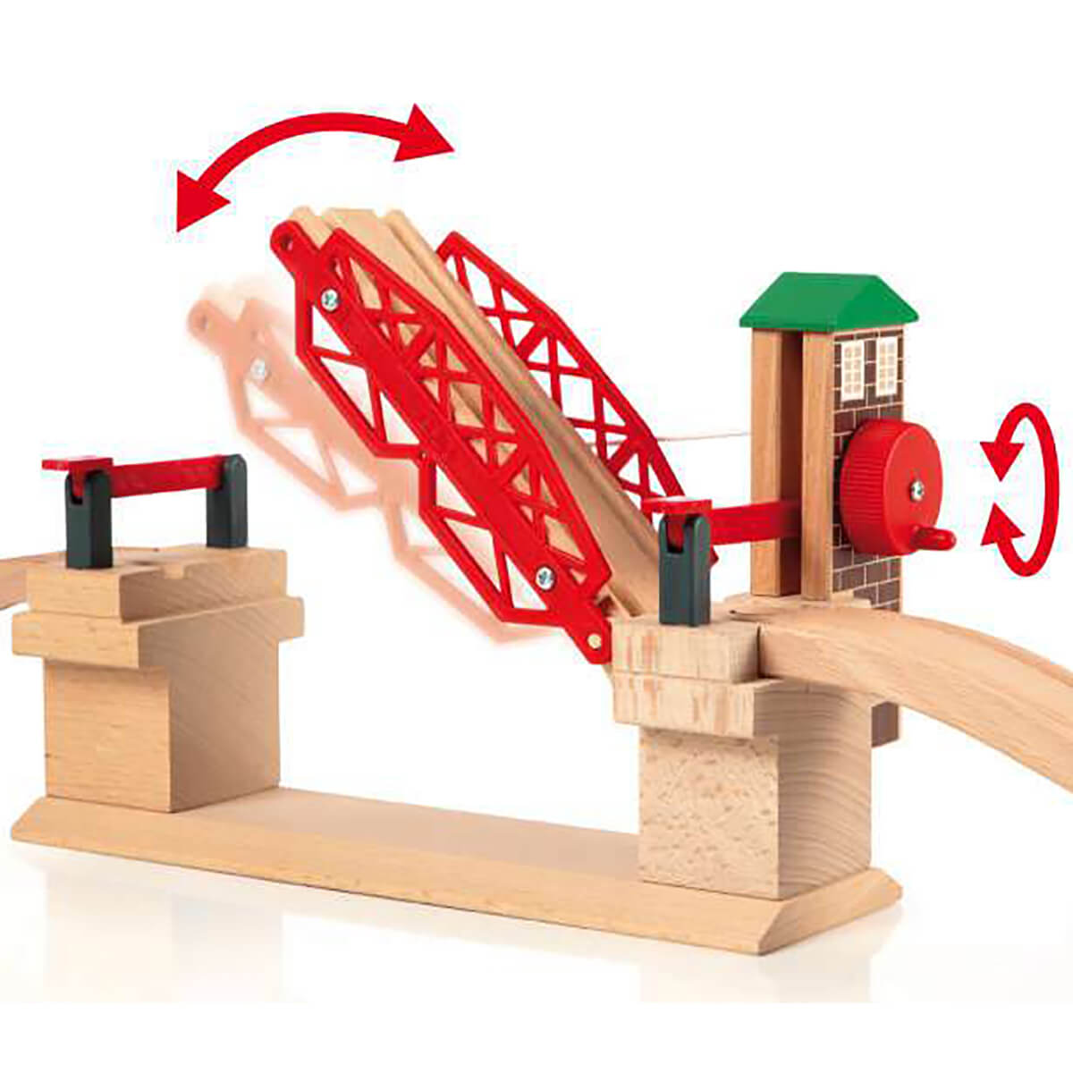 Lifting Bridge by Brio. There’s a boat waiting to pass by at the bridge. Turn the crank to raise the railway draw bridge and manually lower the stop barriers to make sure that no train tries to pass through. This classic BRIO railway bridge also includes 2 ascending wooden tracks for easy connection to the Brio World railway.