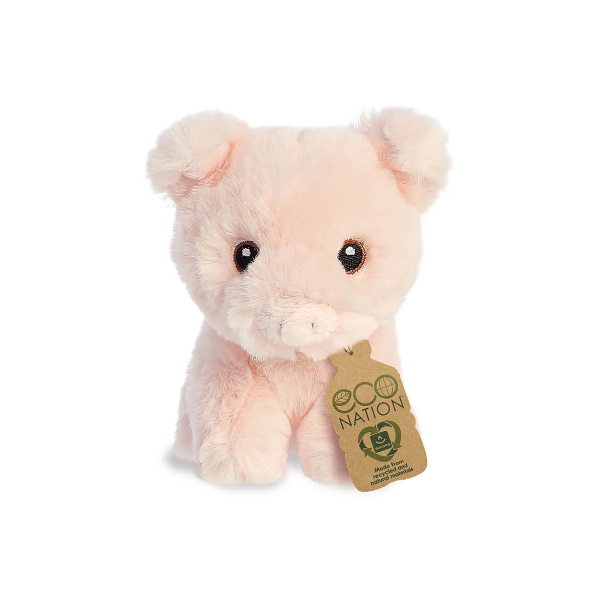Mini Pig Eco Nation Soft Toy by Aurora. This sweet Little pig was once a plastic bottle. This includes the outer plush material and also the fibre fill. The perfect gift for animal lovers.