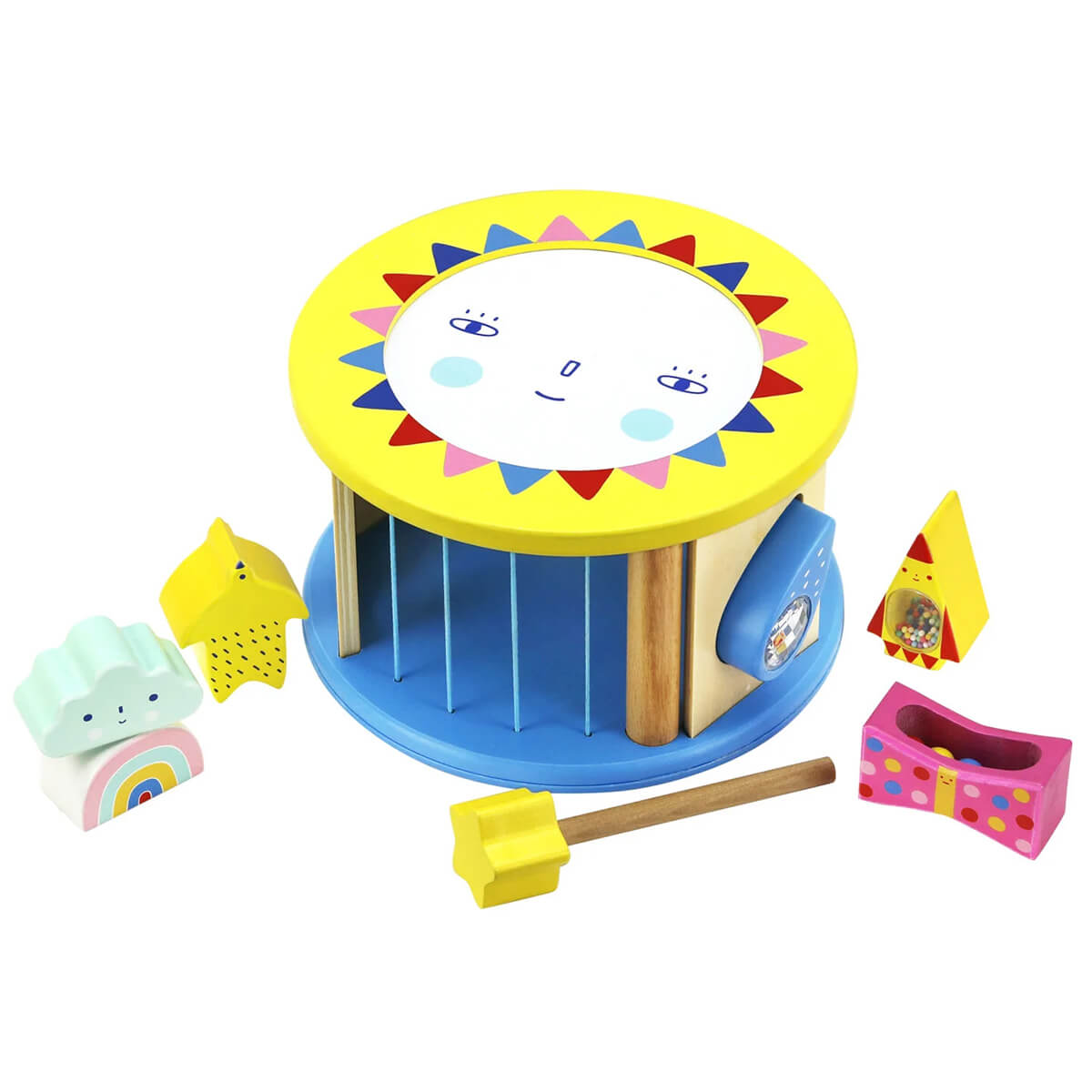 Night And Day Shape Sorter by Vilac. This unusual Night and Day Shape Sorter from Vilac is a stimulating toy for young children with shapes full of surprises as well as a small drum and kaleidoscope.Babies and young children will love this lovely wooden toy with its day and night sides. It will provide hours of stimulating entertainment with shapes to sort that also make their own funny noises. 6 pieces.
