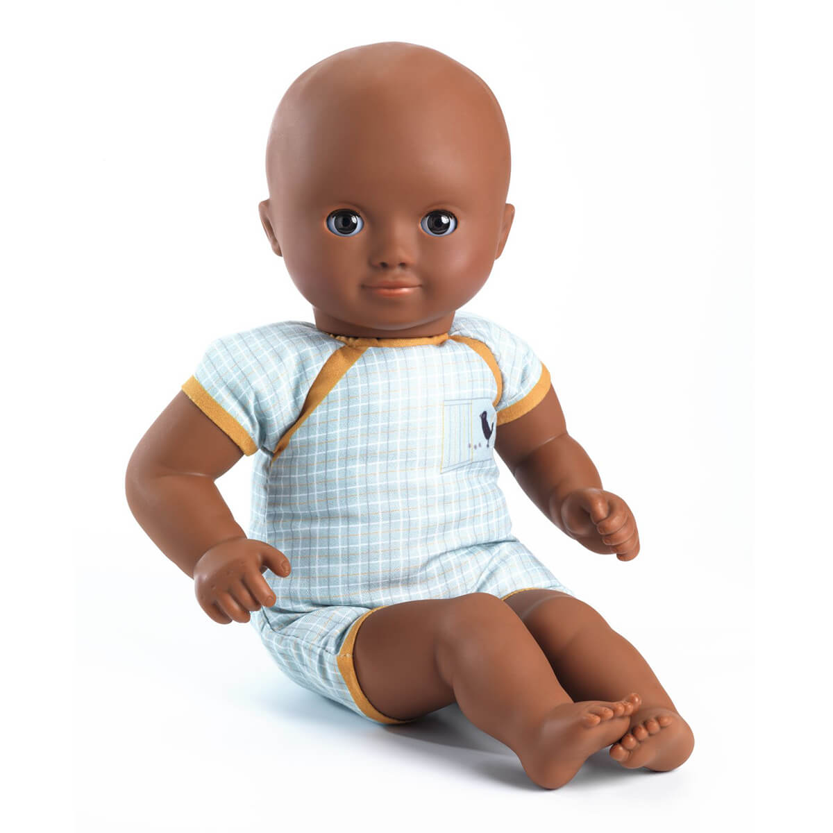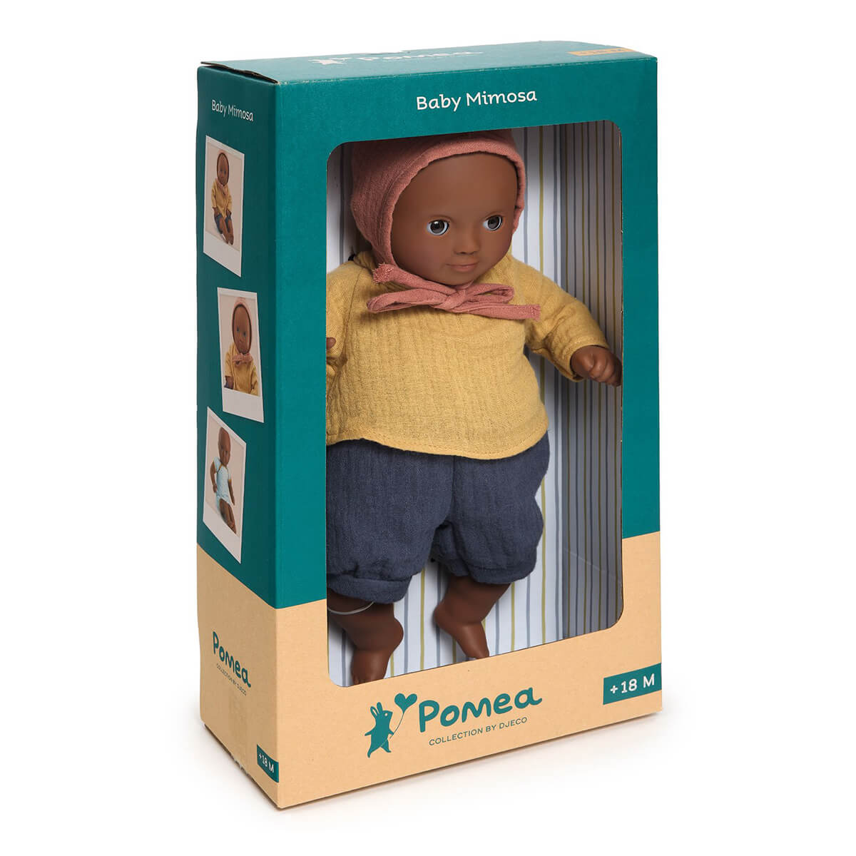 Pomea Baby Mimosa Doll by Djeco. With its beautiful black eyes and a matching outfit, Baby Mimosa is a doll for children from 18 months. It is light and its size (32 cm) is perfectly suited to small arms. Its flexible body is printed with a pretty bodysuit and allows it to be positioned like a real baby. Its face, arms and legs are made of very soft vinyl that is pleasant to the touch. Its sleepy eyes close when it is laid down on its back. This baby doll is dressed in bloomers, a shirt and a bonnet made from 100% cotton double gauze.